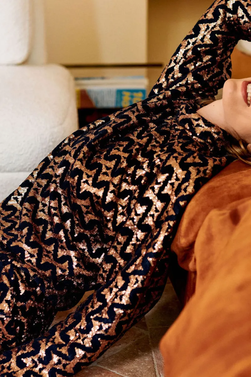 Blouse comme un sweat, en velours bleu marine rebrodé de sequins cuivrés.