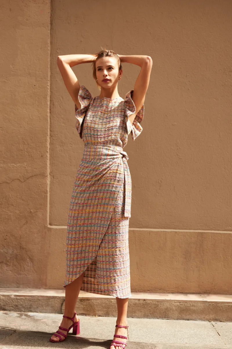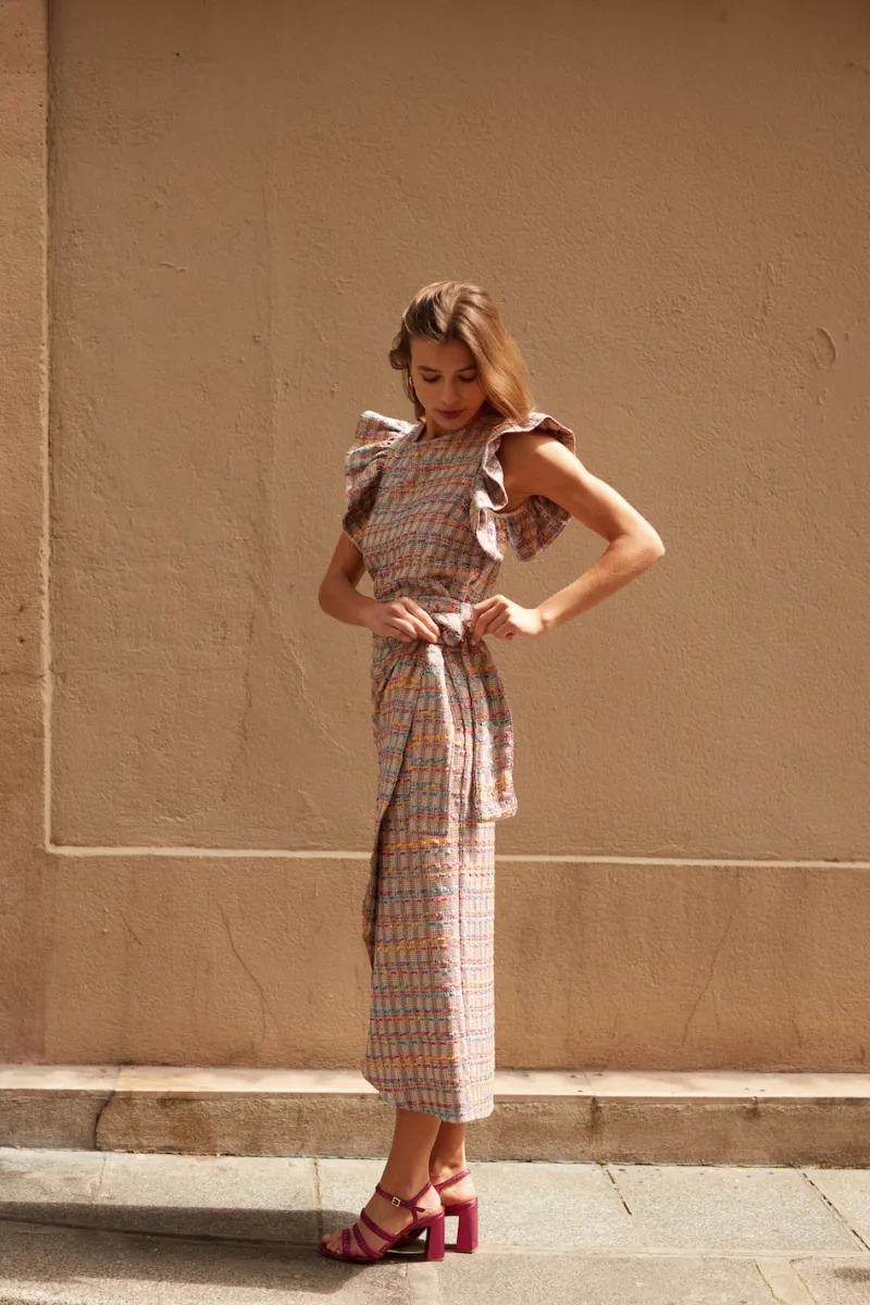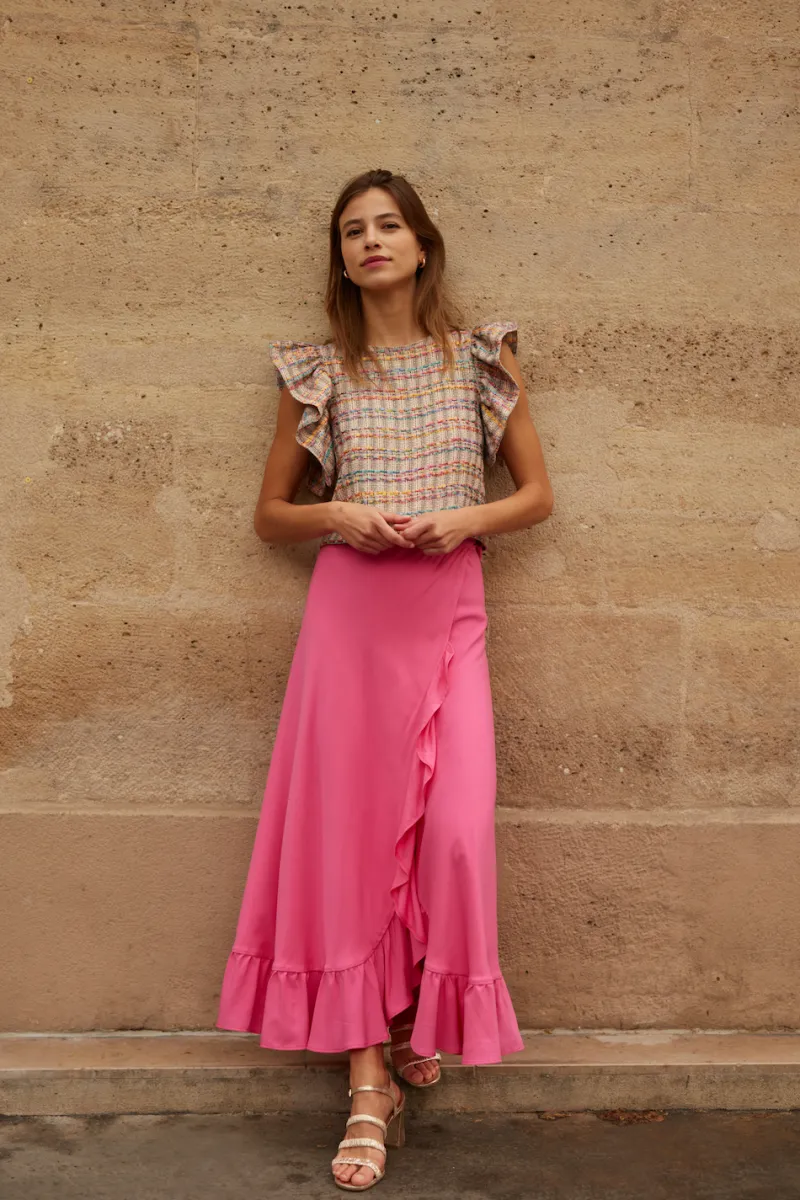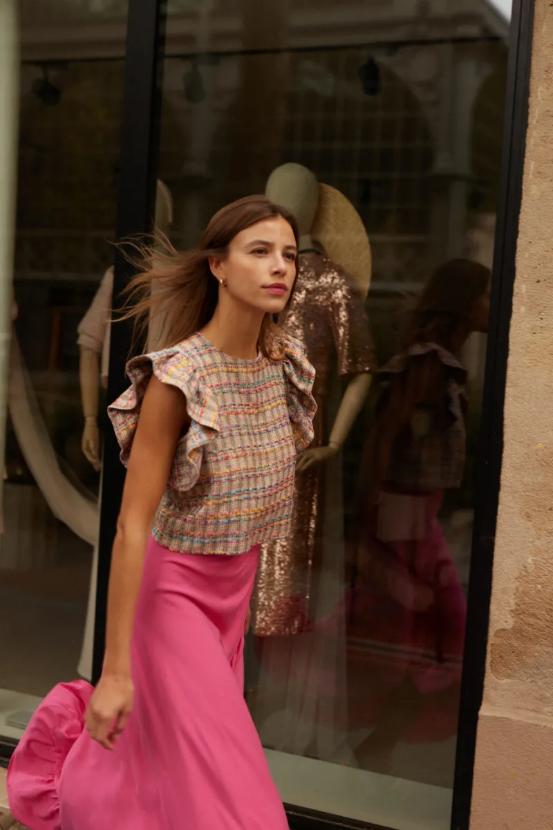 Blouse en tweed sans manches à volants aux épaules.