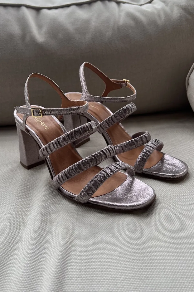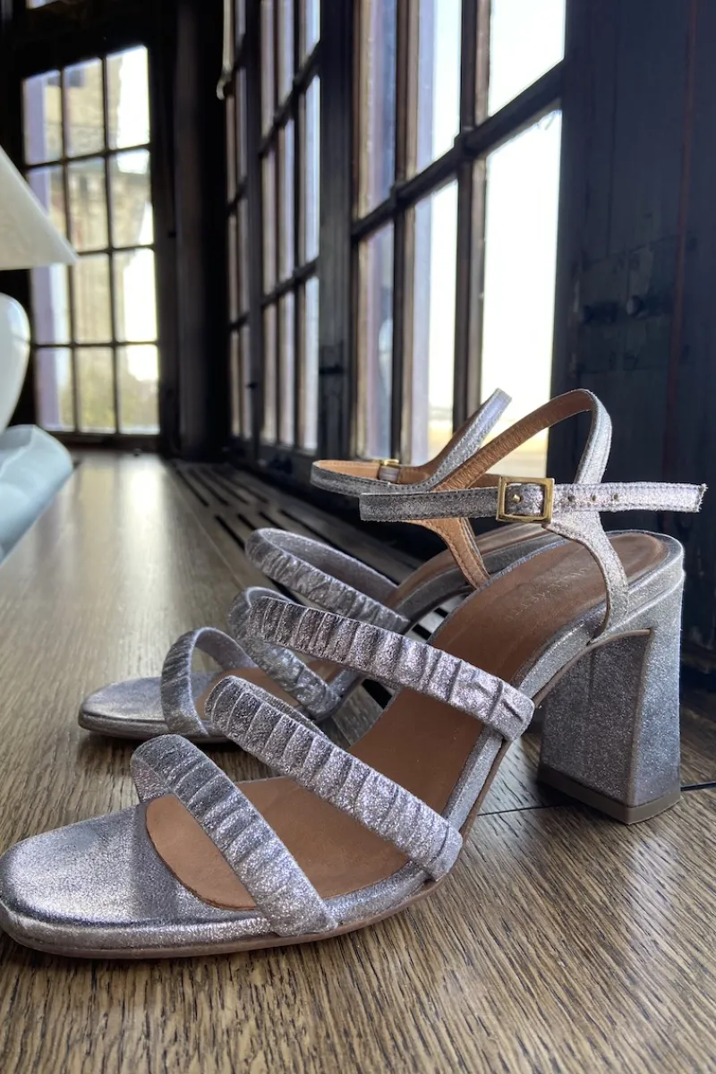 Escarpins à talon en chèvre irisé argenté au sous-ton violet, fermeture par une bride à la cheville avec une boucle dorée.