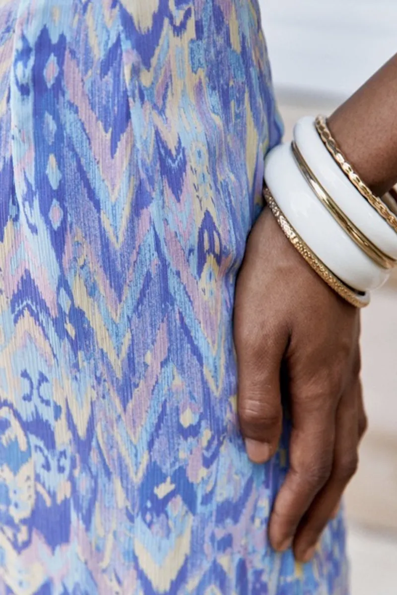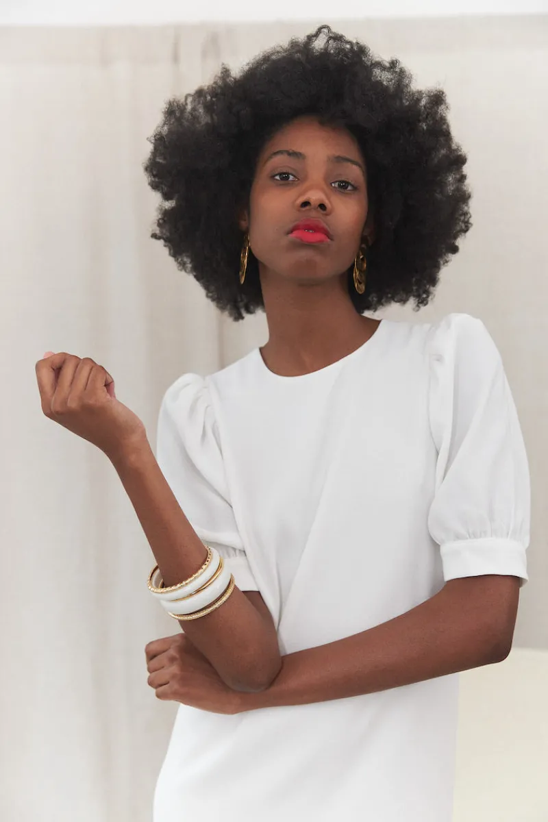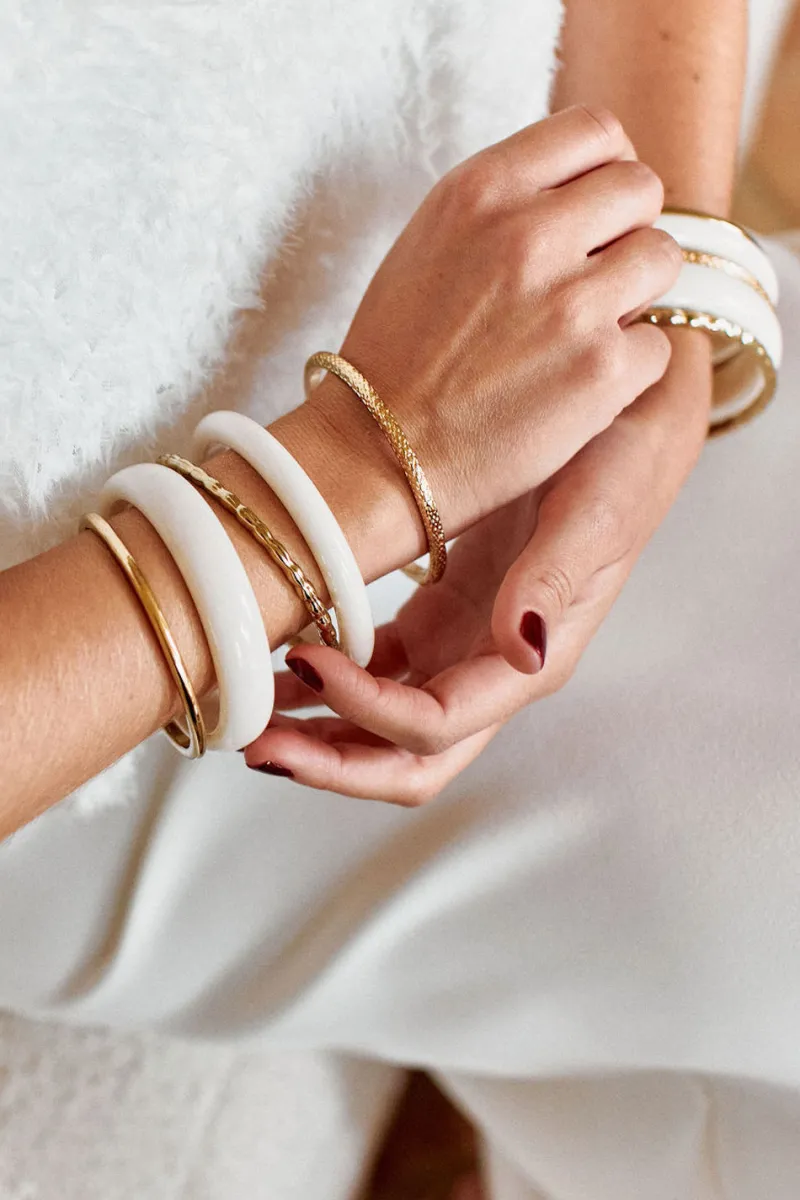 Les deux joncs en résine ivoire sont de deux largeurs différentes. Les trois joncs en métal dorés sont texturés différemment.