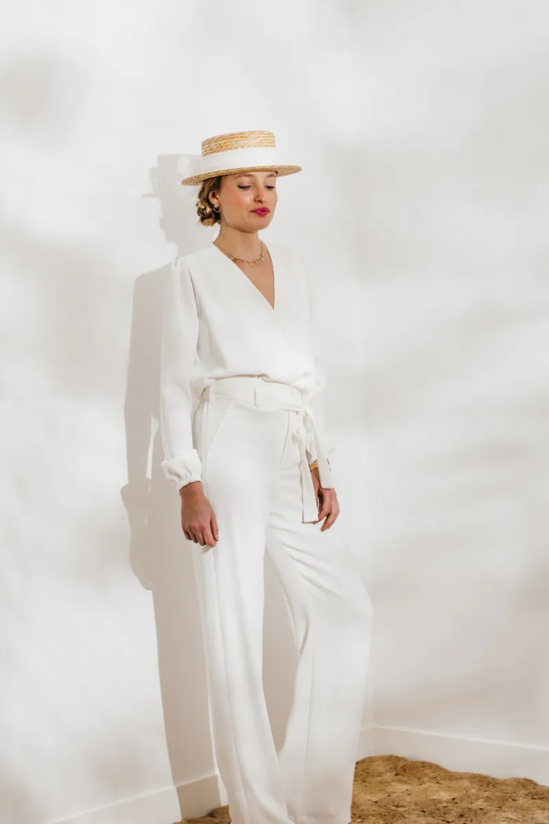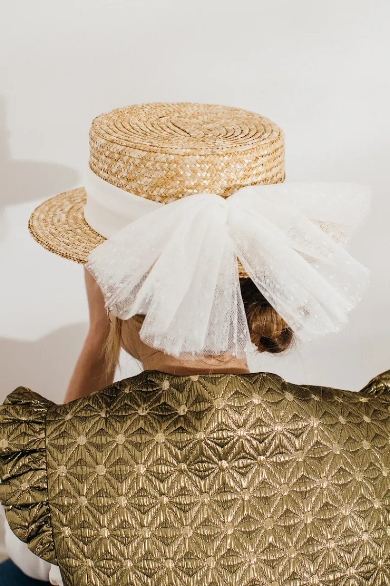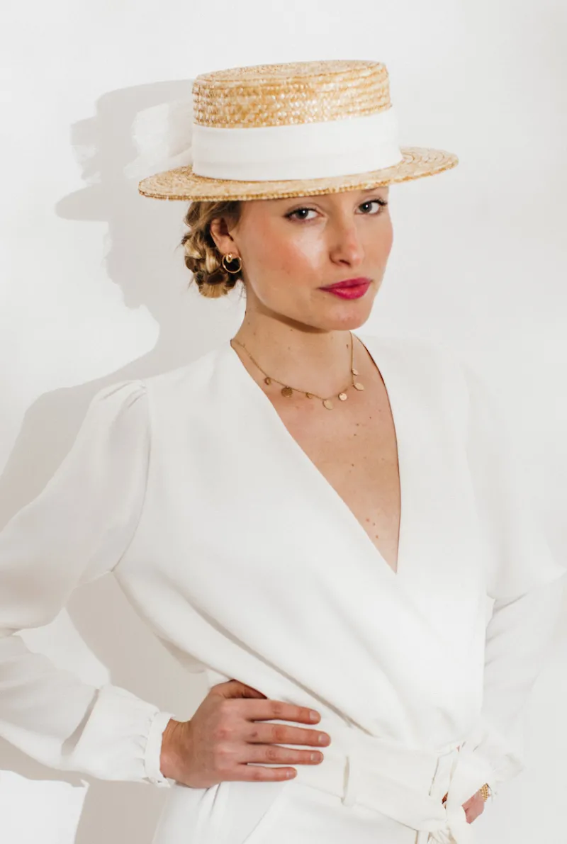 Ce canotier est à la fois couture et bohème, légèrement masculin. On aime le contraste entre la légèreté du tulle plumetis et le large ruban en crêpe ivoire.