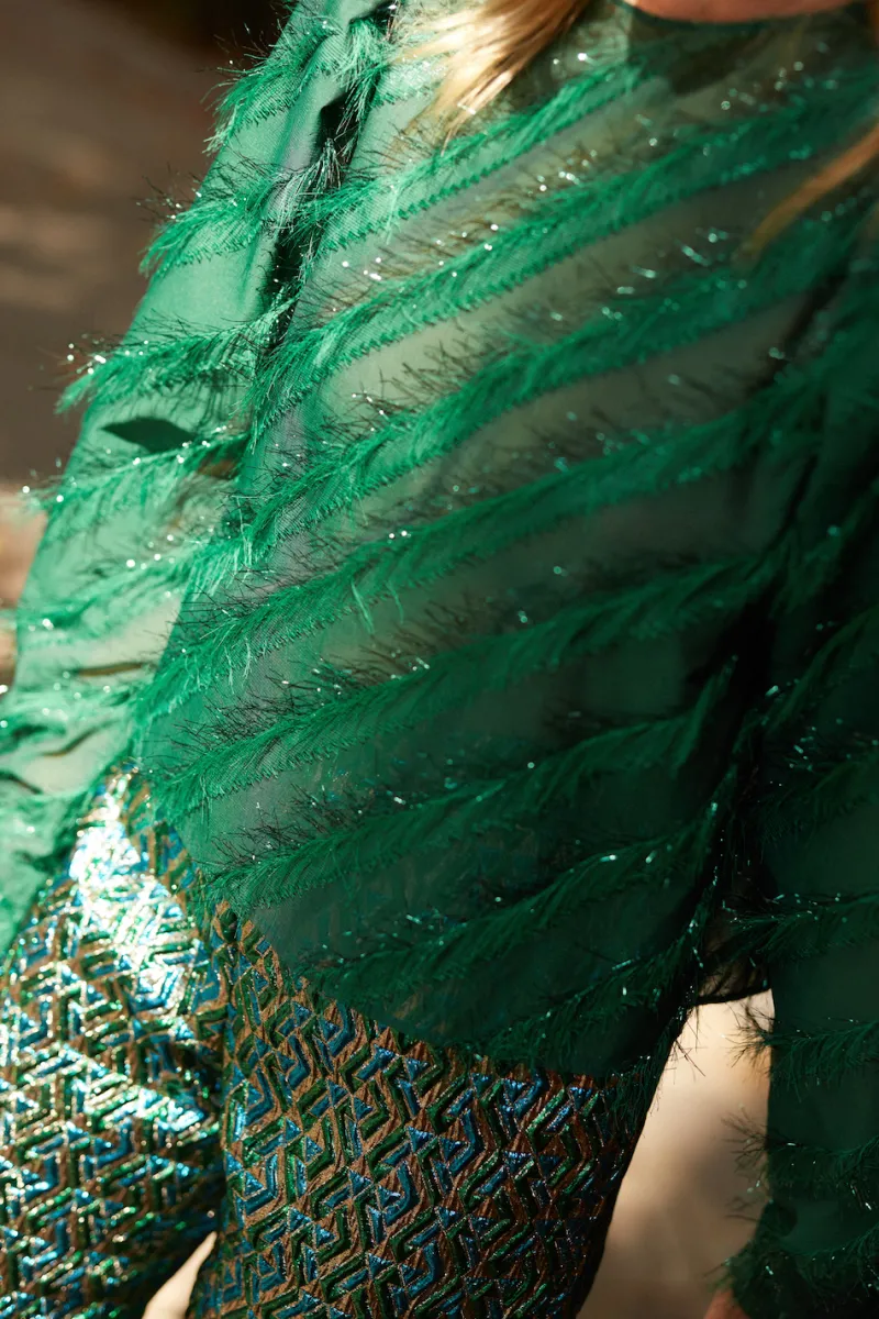 Cette blouse ultra couture apporte élégance et légèreté à votre tenue. Ses franges, semblables à des plumes, ajoutent une touche de douceur, le tout sublimé par une subtile transparence.