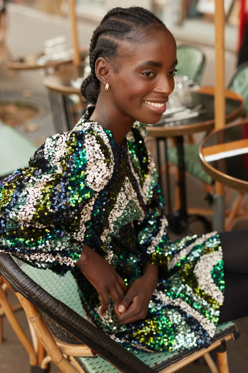 On ose la robe Palace et ses sequins étincelants ! Pièce incontournable de notre Nouvelle Collection, elle vous donnera le sourire et illuminera votre teint. Des jolies épaulettes pour une allure couture et des sequins au motif 70s pour briller de jour comme de nuit.