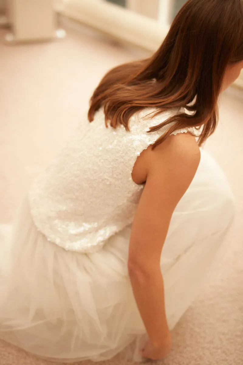 Blouse sans manches en sequins mates, fermeture zip dans le dos.