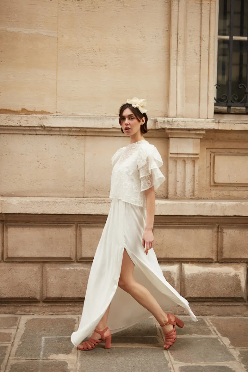 Jupe longue ivoire fluide avec une grande fente sur le côté.