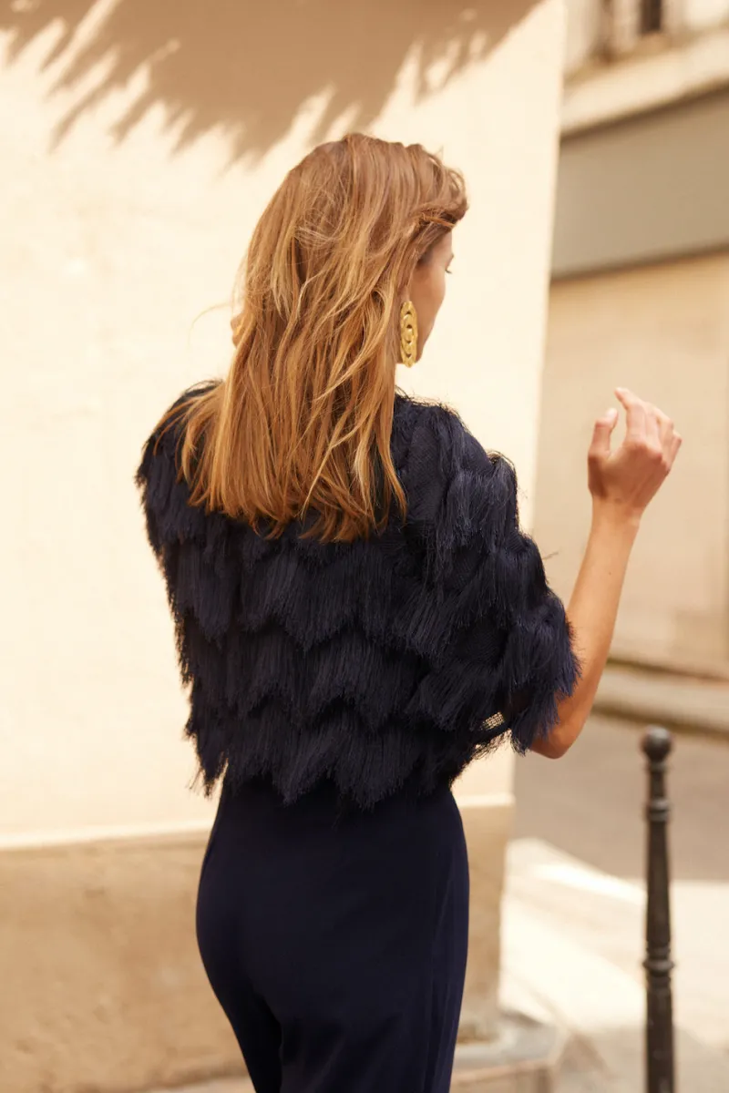 Blouse à franges marine et aux manches mi-longues. Fermeture zip au dos.