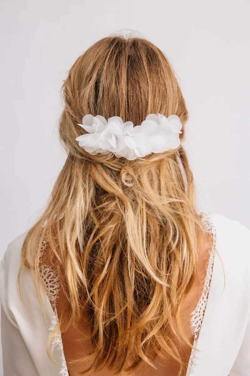 On aime les pétales d’organza qui offrent un côté aérien et romantique aux coiffures.