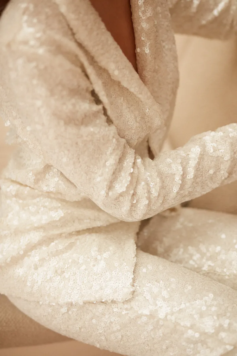 Découvrez notre nouvelle veste smoking Santiago, entièrement recouverte de sequins. Vous pouvez l’associer à notre pantalon Santiago pour un effet costume ultra couture et glamour.