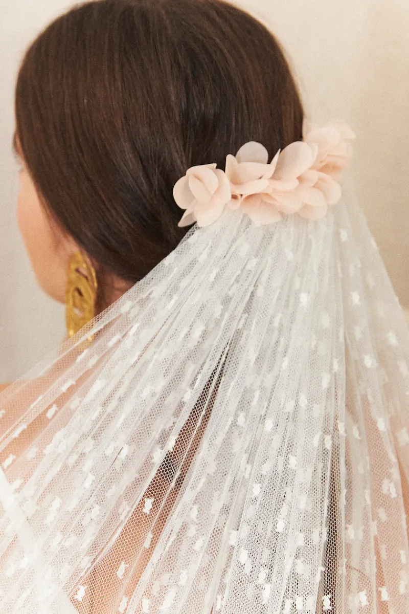 Voile fluide en tulle plumetis ivoire monté sur un peigne doré à l’or fin.