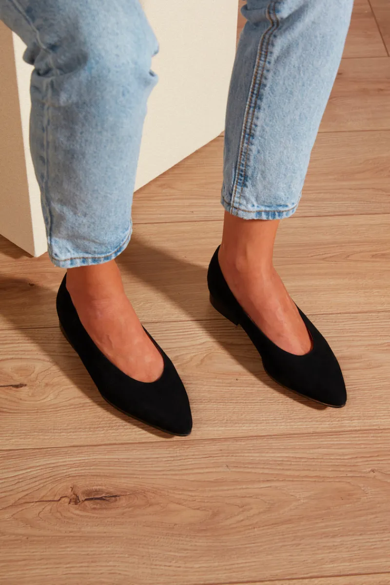 Ballerines avec talonnette en chèvre velours noir, bout pointu.