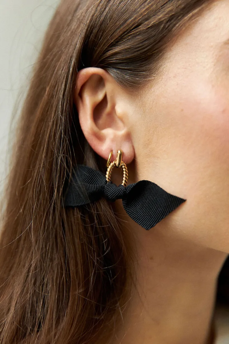 Boucles d’oreilles aériennes dorées ornées d’un noeud en gros grain noir.