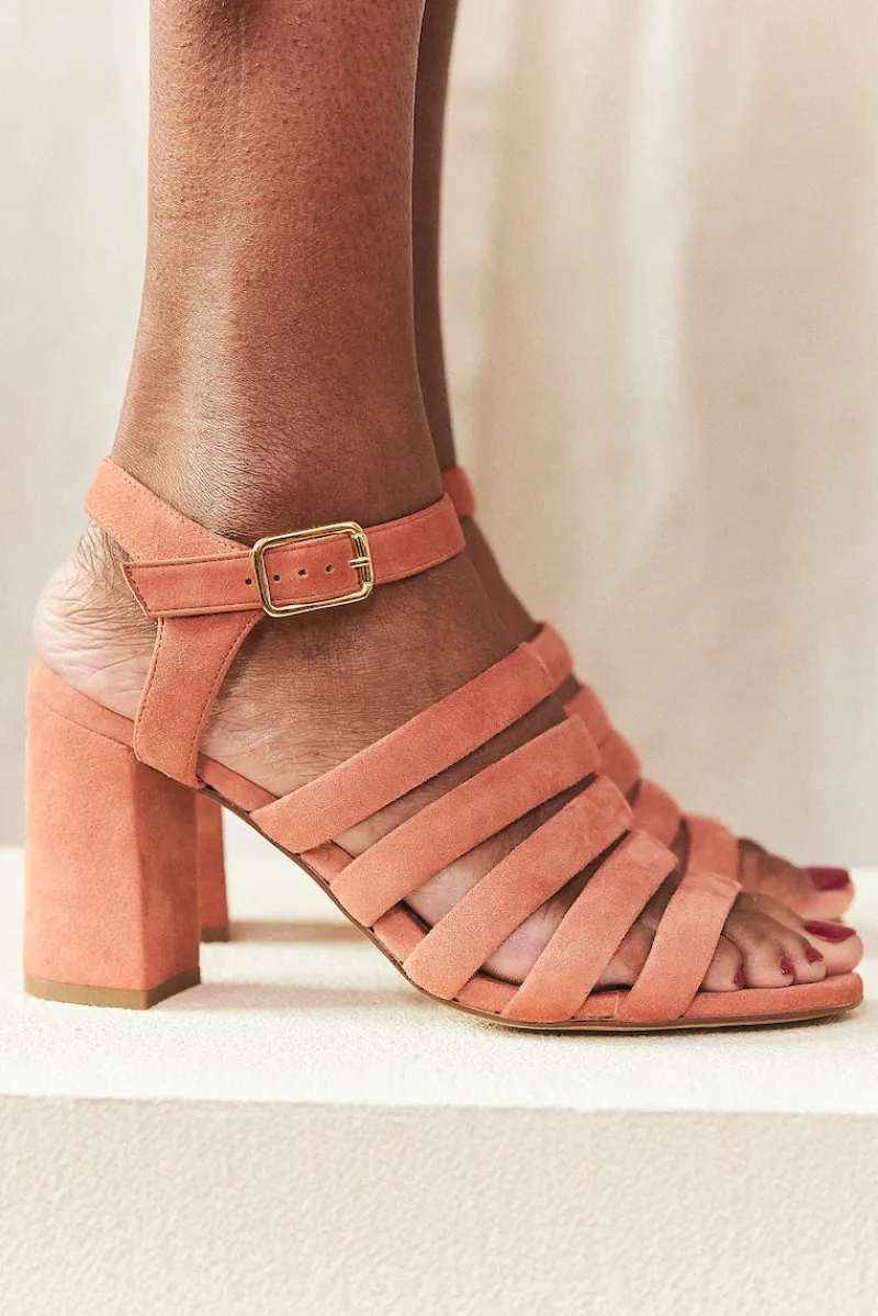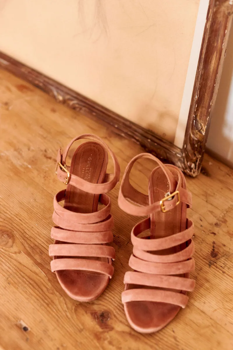 Escarpins à talon en chèvre velours rose blush, fermeture par une bride à la cheville avec une boucle dorée.