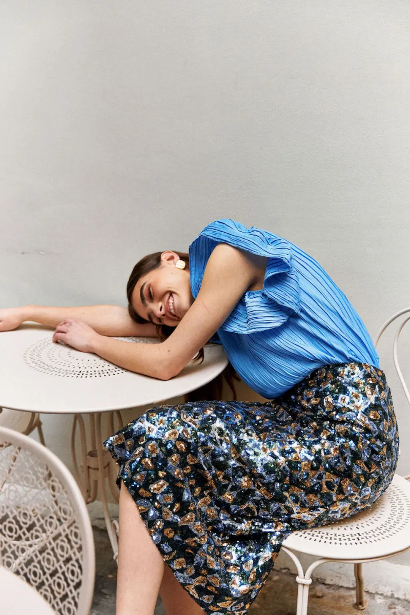 Inspirée directement de notre jupe longue Dream adorée ! En été, elle révélera votre bronzage et en hiver elle réveillera un simple pull en cachemire noir ! Une jupe en sequins disposés en motifs originaux c’est aussi la promesse de jours festifs, l’envie d’apporter de la lumière dans nos armoires et de s’amuser avec nos garde-robes.