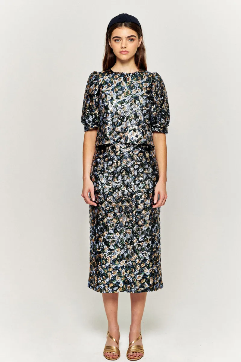 Longue jupe droite en sequins aux motifs géométriques. Fermeture avec zip invisible au dos.