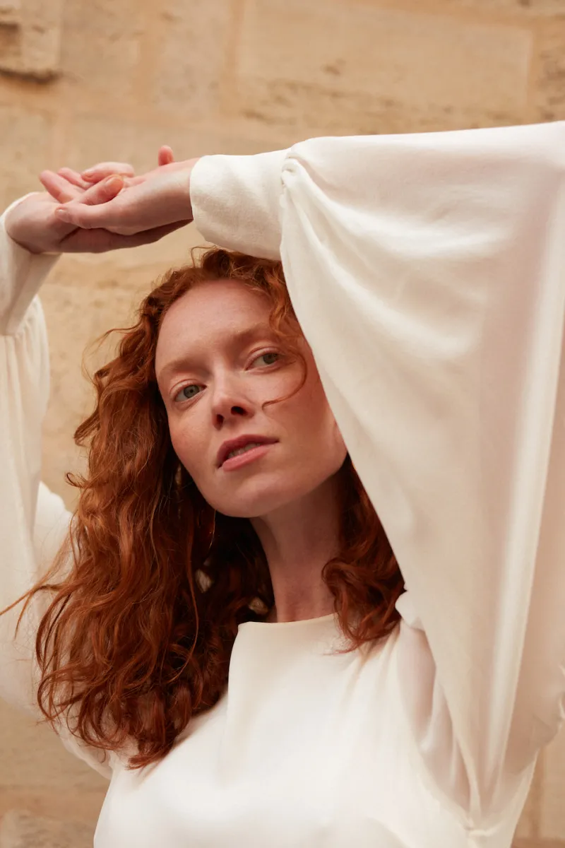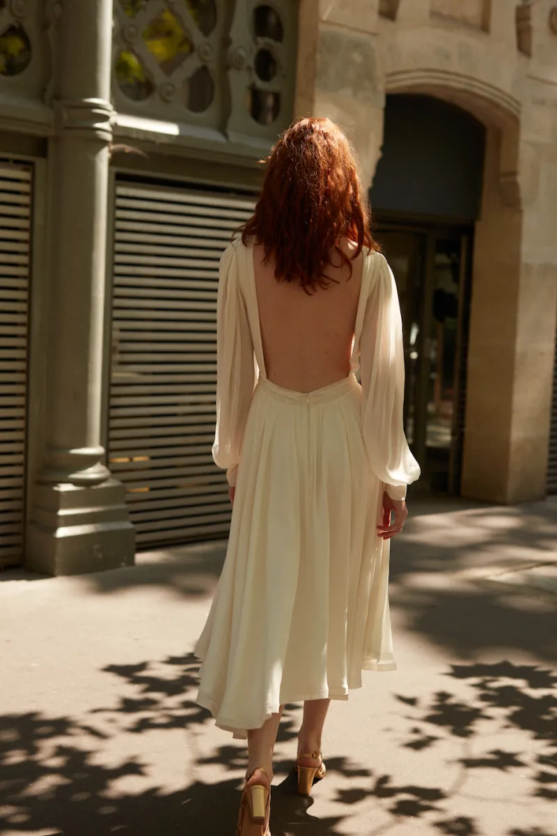 La soie fluide de la robe Yves lui confère un mouvement et un drapé uniques, soulignée par un profond dos nu, des manches bouffantes et une taille resserrée. Véritable ode à la féminité, la robe Yves est la définition absolue d’un romantisme minimaliste et élégant.