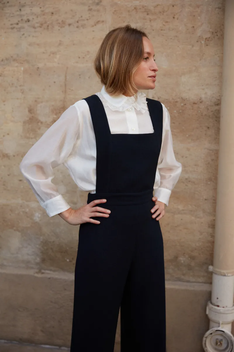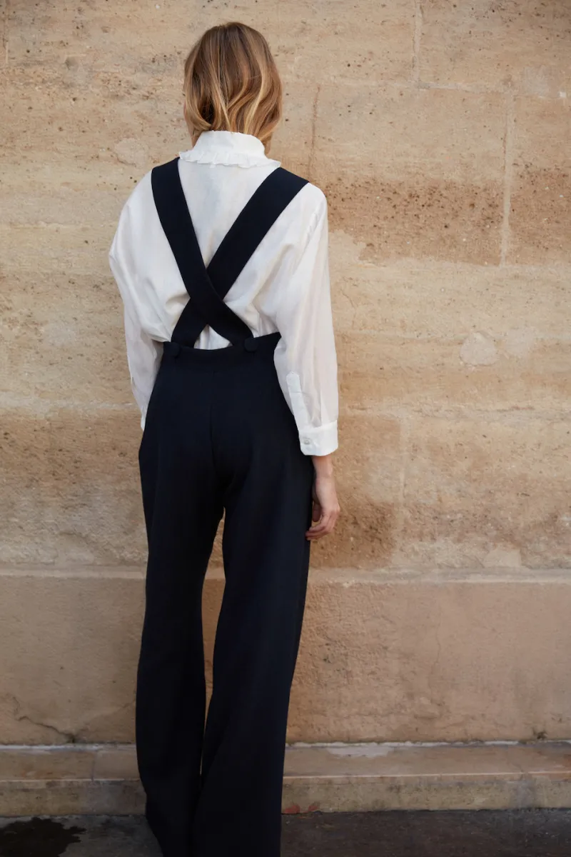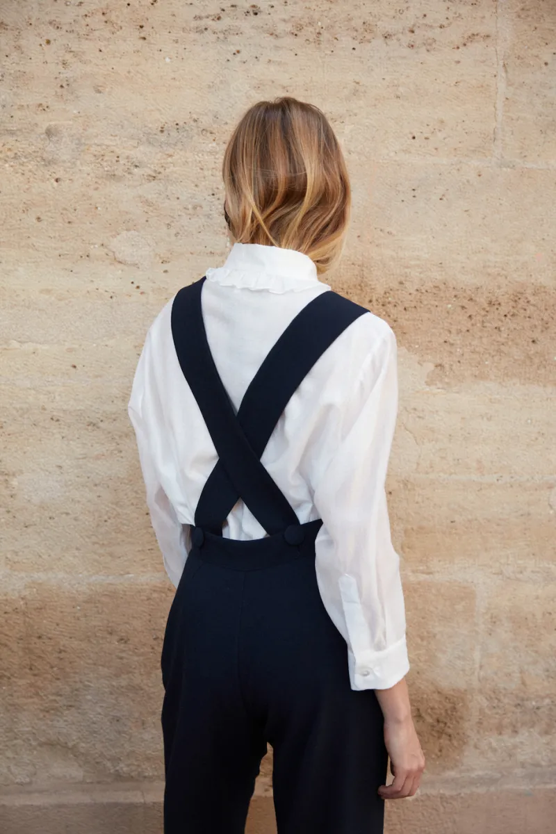 Combinaison marine à bretelles et boutons couverts au dos. Fermeture à zip sur le côté.