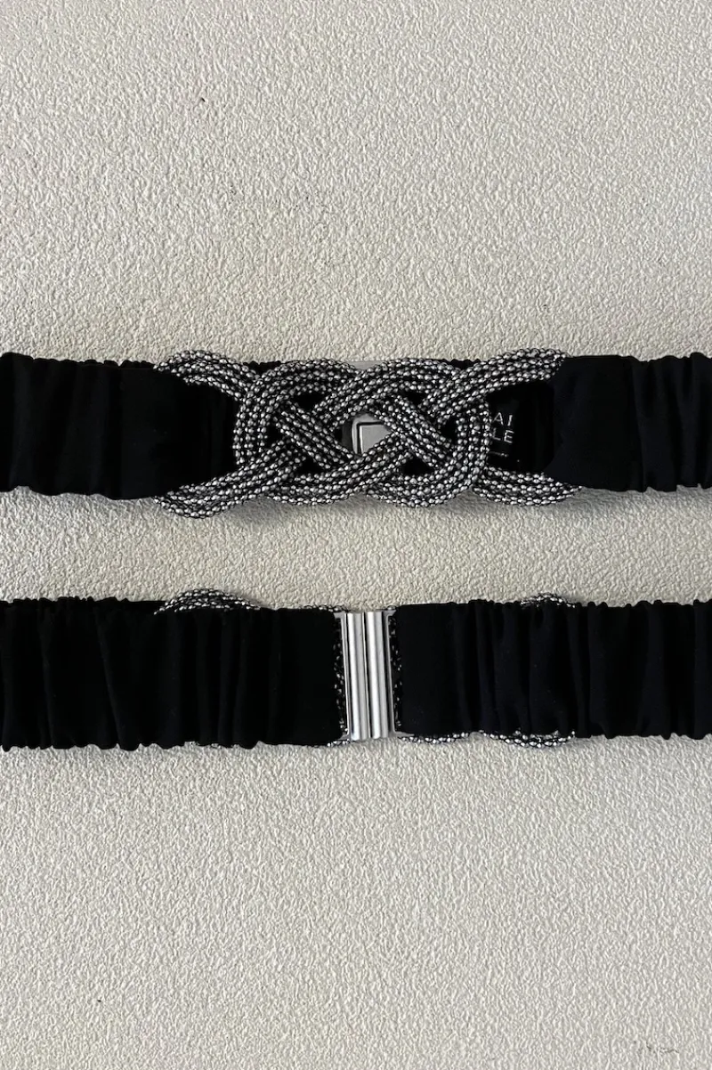 Ceinture élastique en crêpe noir, boucle bijou et fermoir argenté.