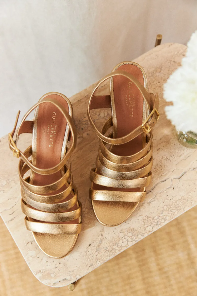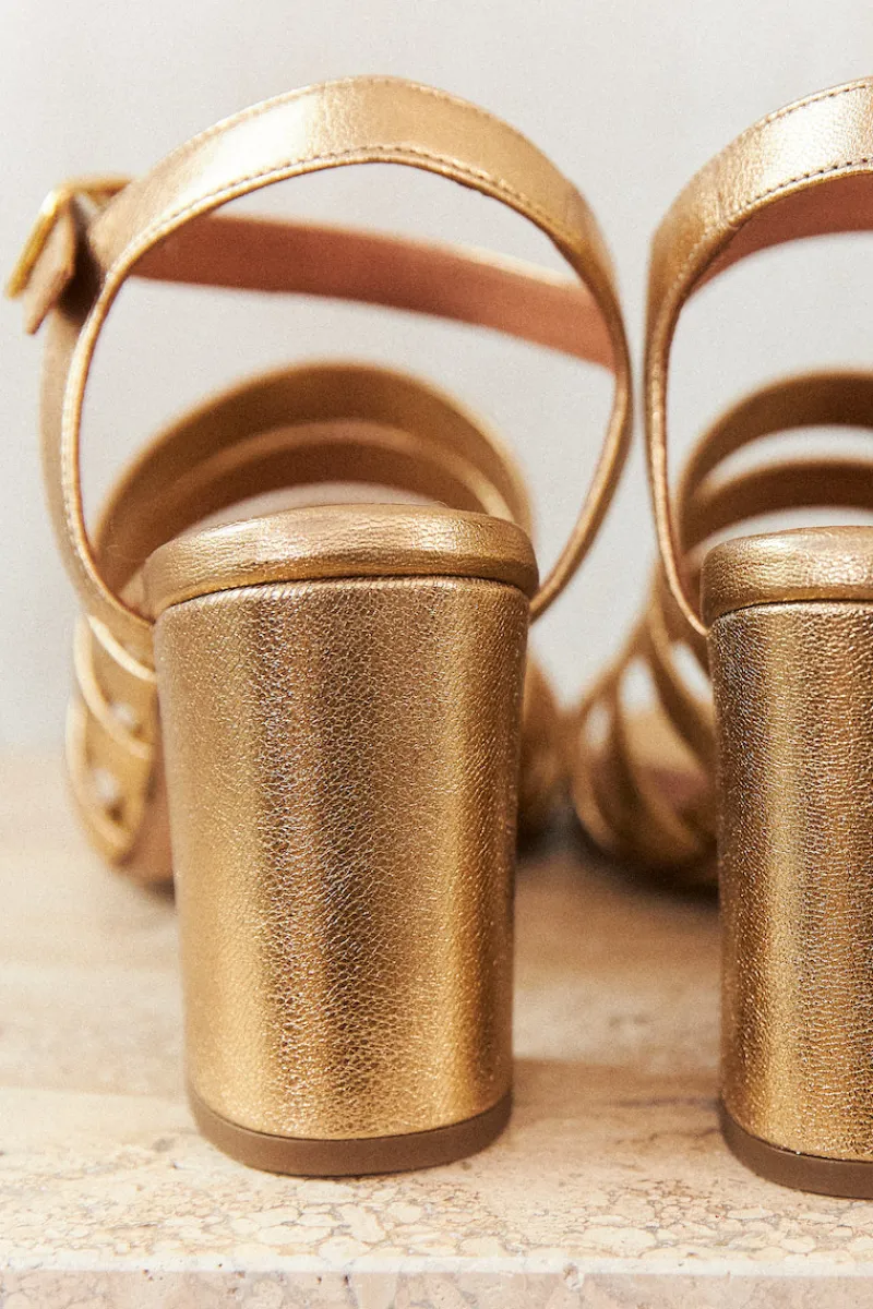 Escarpins à talon en chèvre métal doré, fermeture par une bride à la cheville avec une boucle dorée.