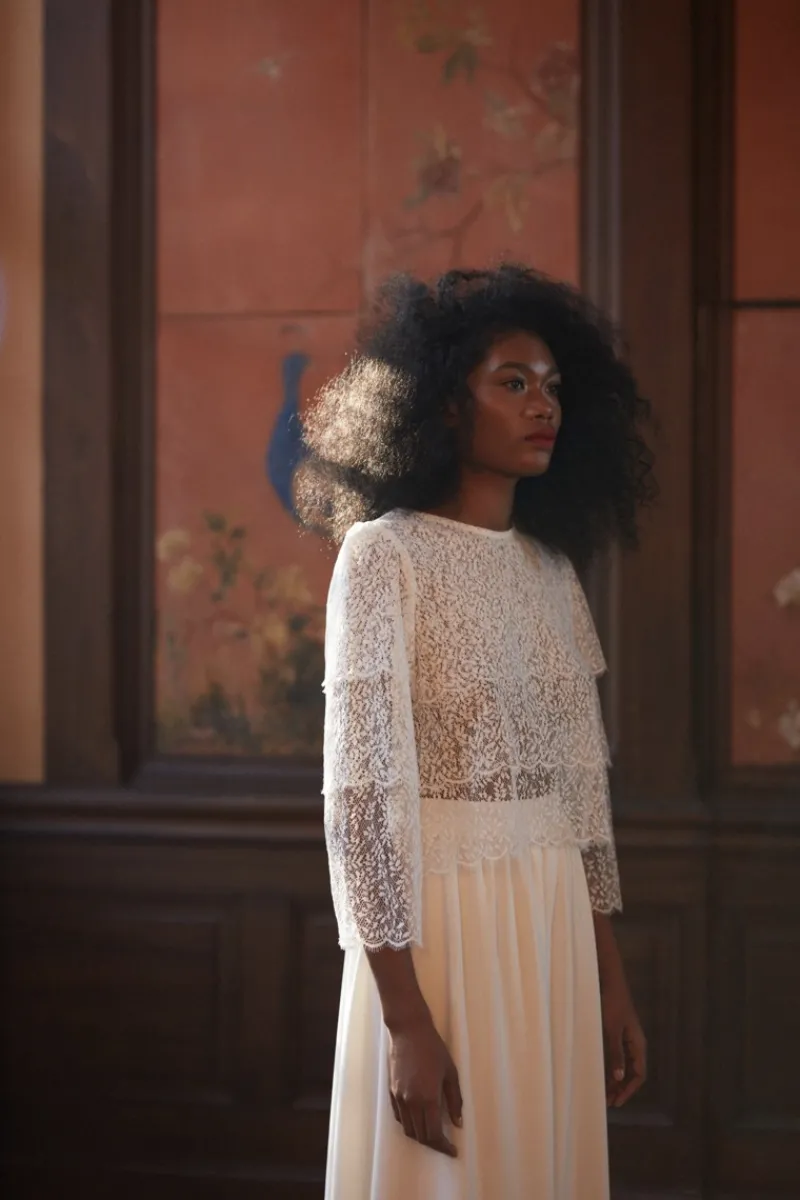 Blouse ivoire toute en dentelle.