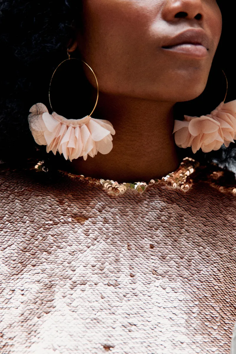 Boucles d’oreilles plaqué or ornées de pétales d’organza rose pâle.