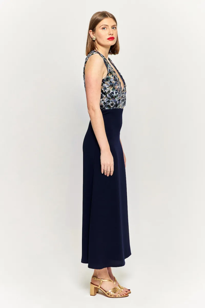 Robe longue sans manches à sequins et au décolleté plongeant. Fermeture zip au dos.