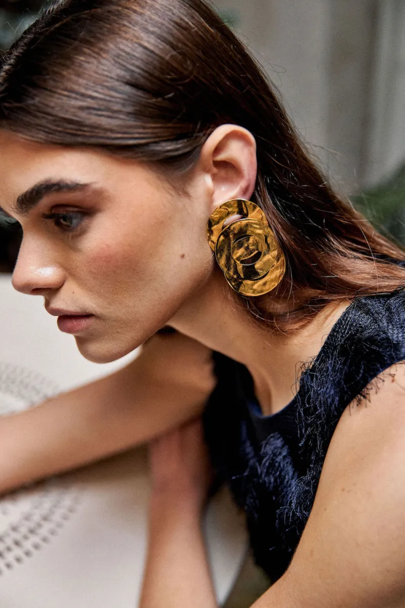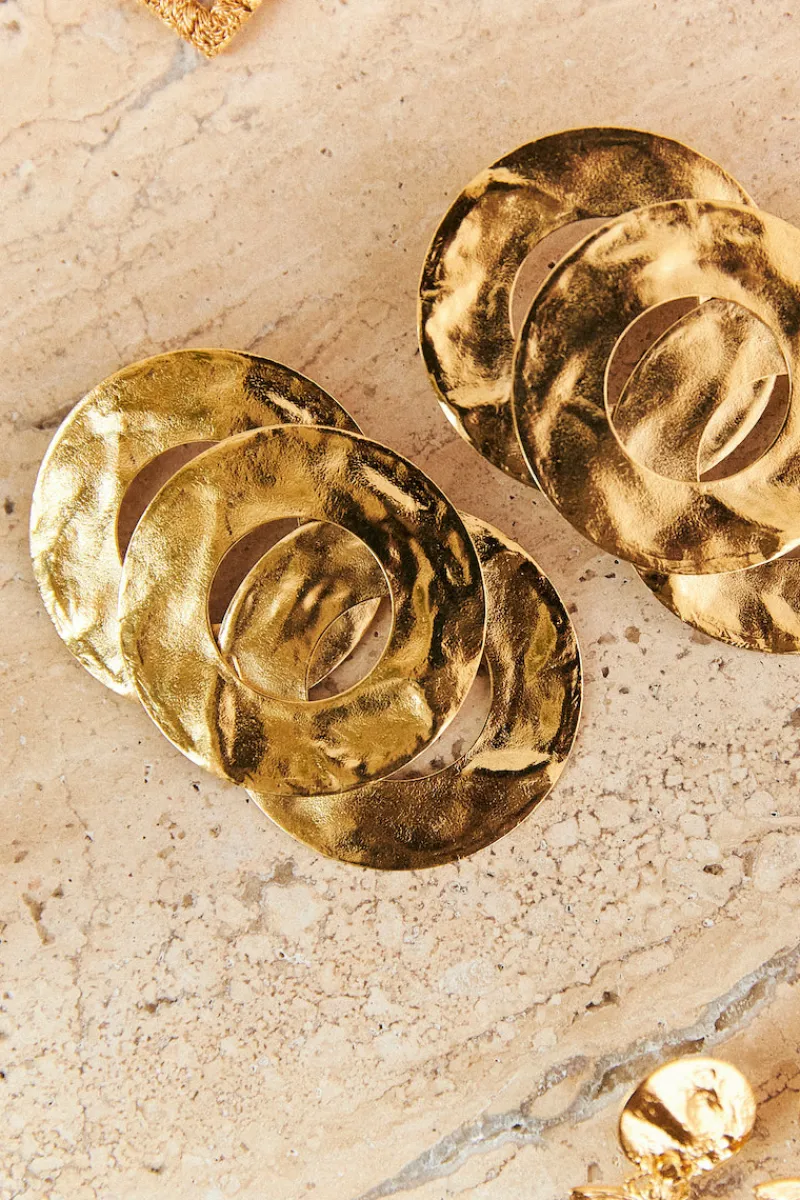 Boucles d’oreilles faites de trois anneaux superposés plaqué or.