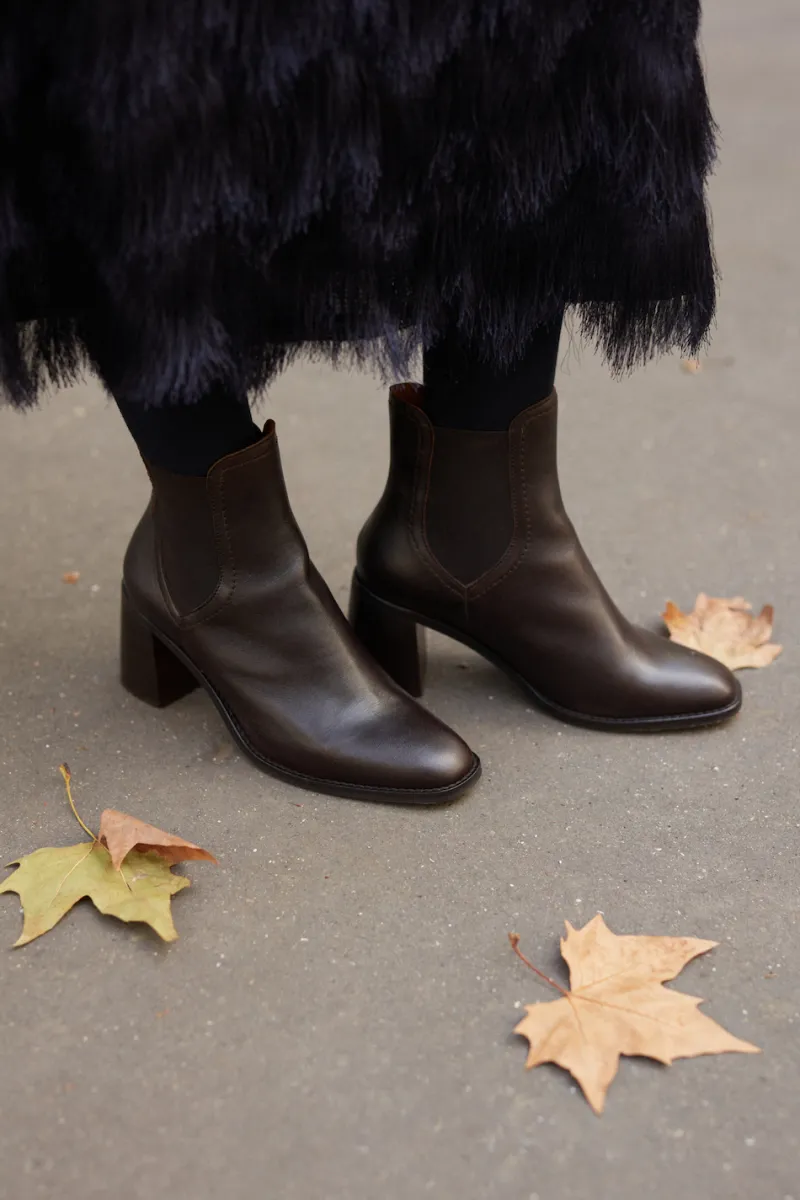 Bottines à talon en cuir de chèvre lisse marron foncé, élastiques sur les côtés.