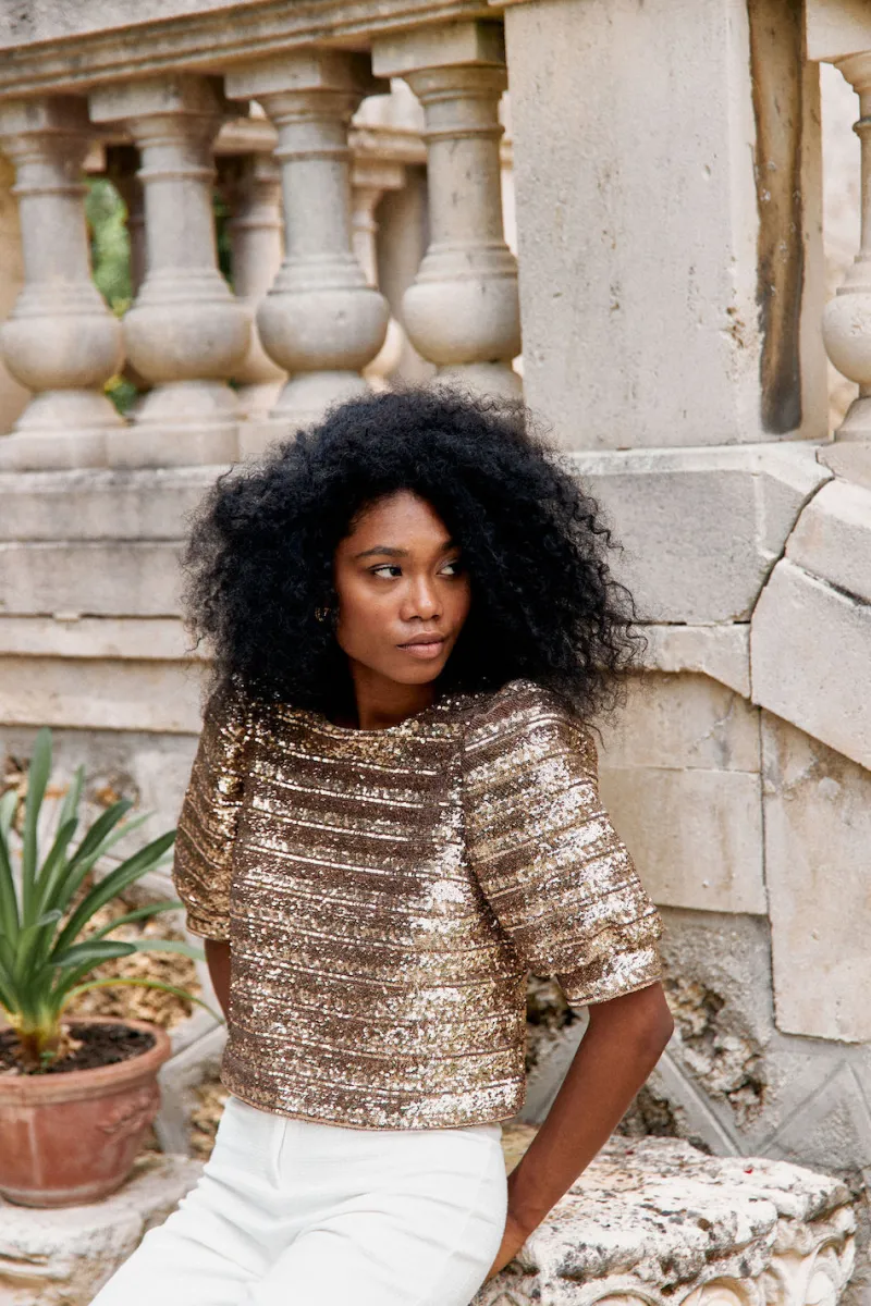 Blouse courte en sequins et aux manches ballon. Fermeture zip au dos.