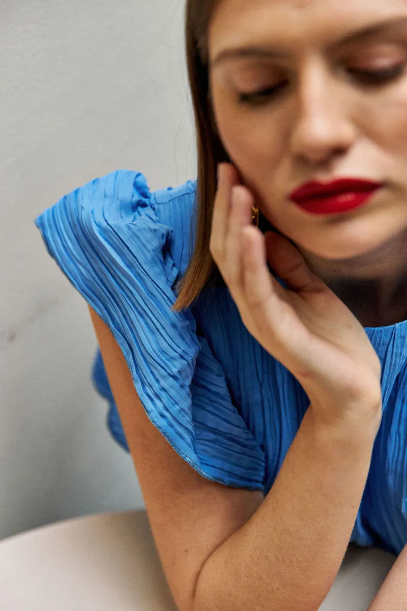Robe longue sans manches avec des volants aux épaules en tissu plissé. Fermeture zip au dos.
