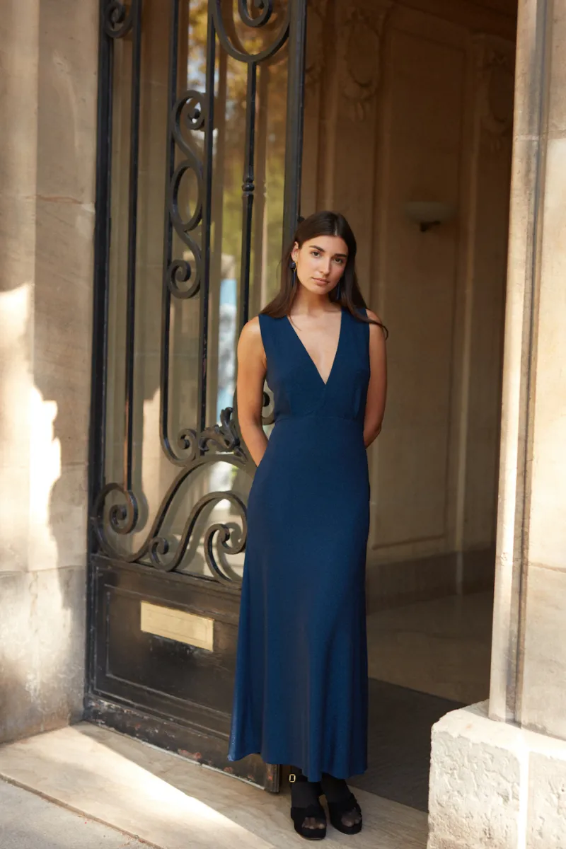 La robe Jersey se distingue par son décolleté plongeant à la poitrine et dans le dos. Sa jupe fluide accompagne élégamment vos mouvements. On craque pour ce tissu marine irisé, à la fois élégant et sophistiqué.