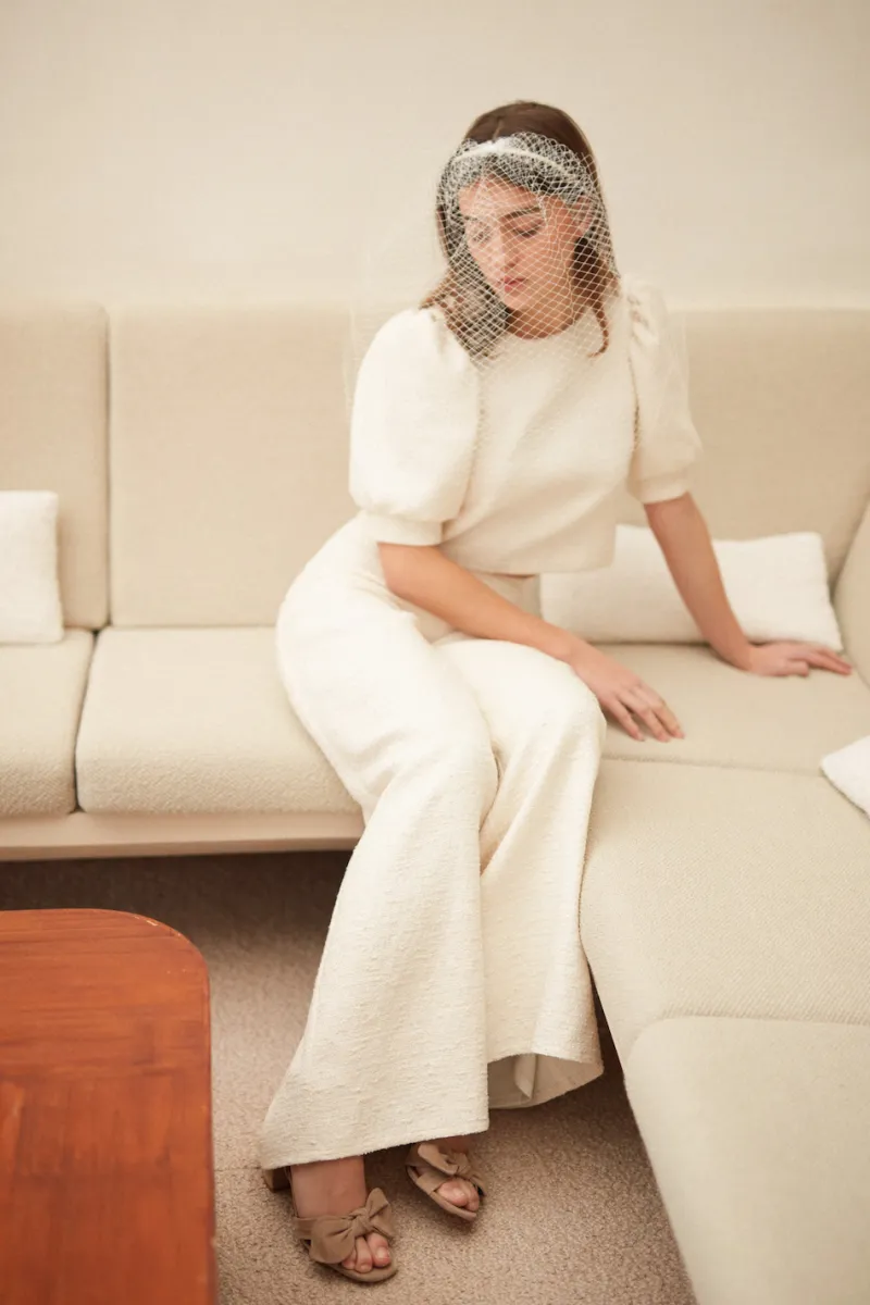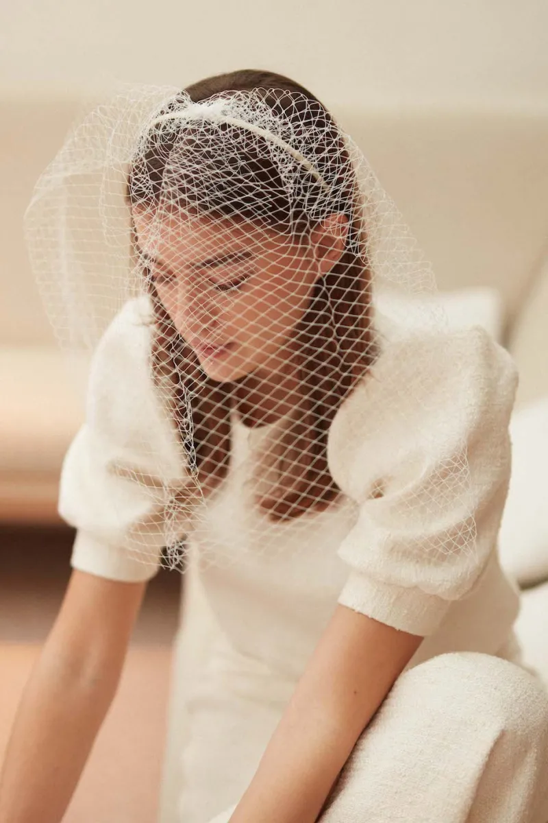 On aime cette voilette légèrement rétro, féminine et élégante. Elle apporte une touche de glamour et de mystère à la silhouette.