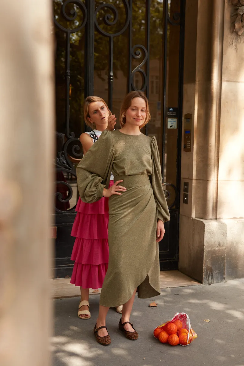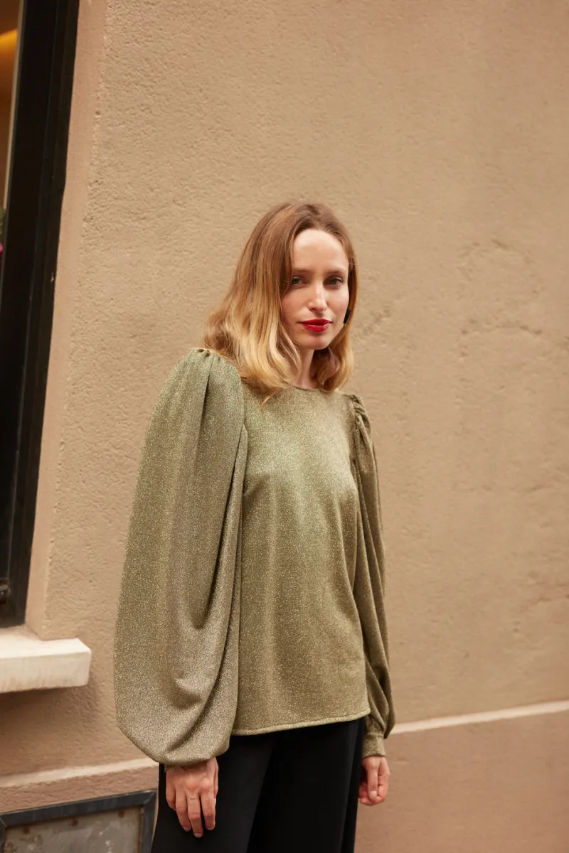 La blouse Jersey Or est une pièce élégante et ultra confortable. Ses manches larges resserrées au niveau des poignets vous confèrent une allure sophistiquée et glamour. Vous pouvez porter cette pièce au-dessus de notre robe Jersey Or pour couvrir vos épaules, ou encore l’associer à un pantalon pour un look plus décontracté.