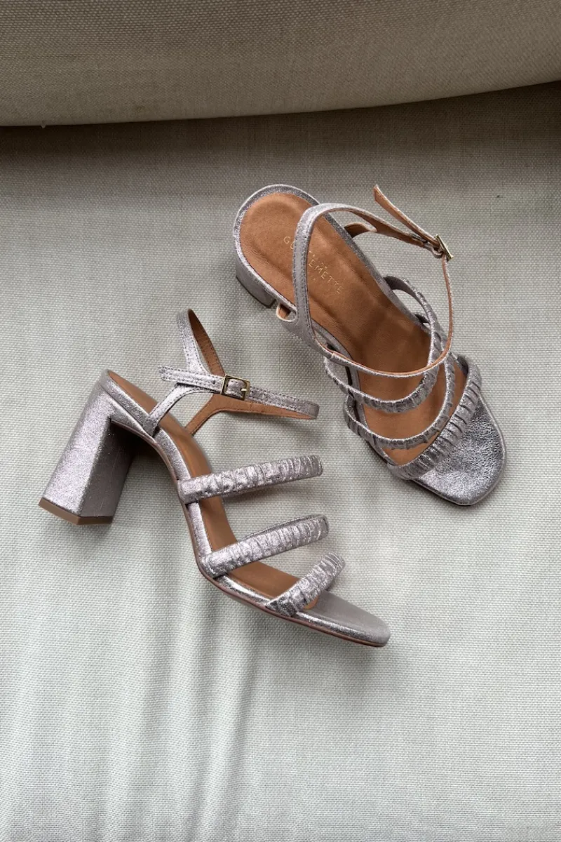 Escarpins à talon en chèvre irisé argenté au sous-ton violet, fermeture par une bride à la cheville avec une boucle dorée.