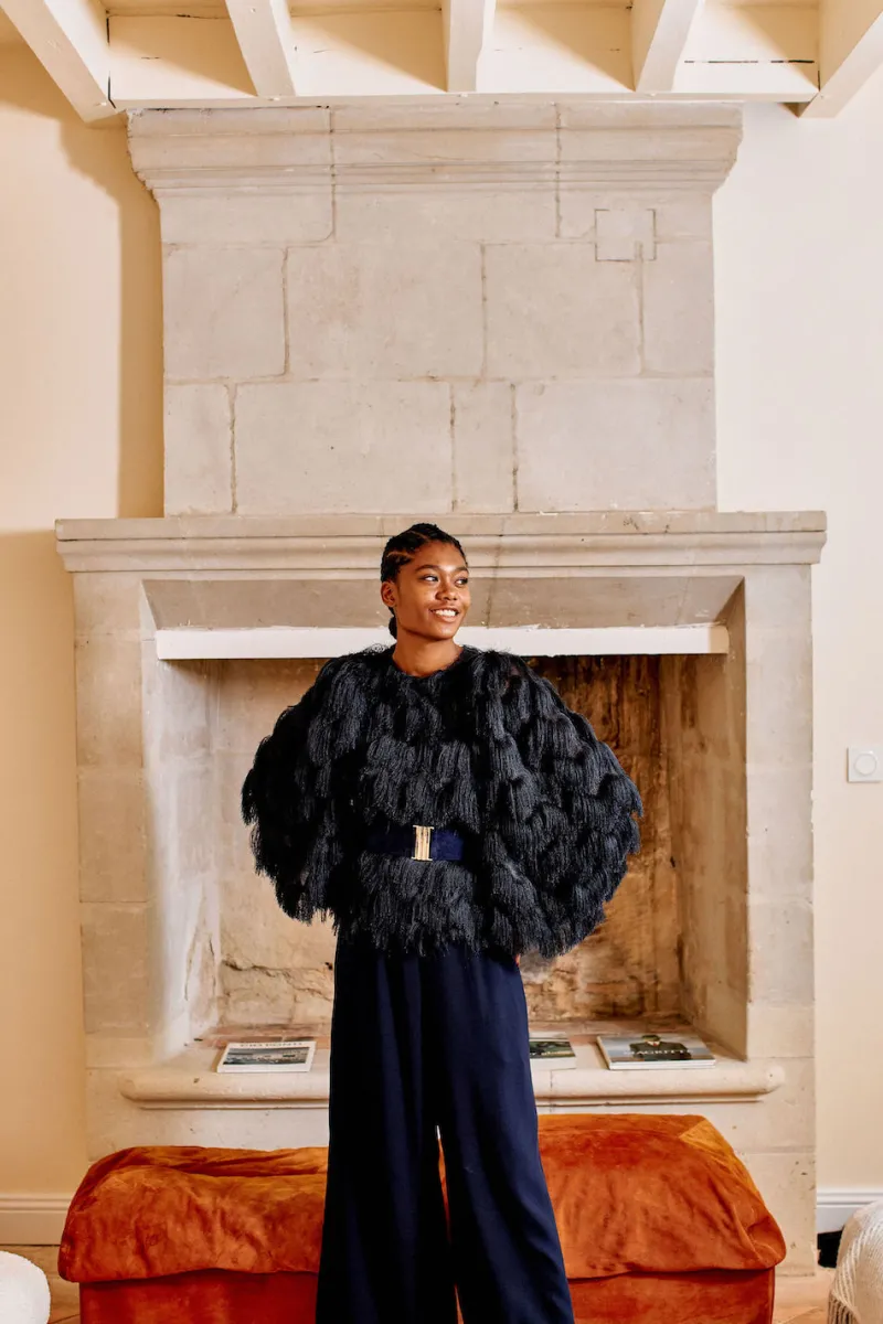 La mannequin mesure 1,73m et porte la taille XS.