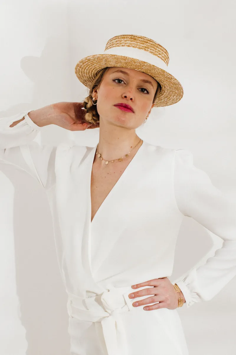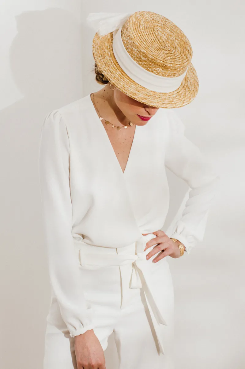 Ce canotier est à la fois couture et bohème, légèrement masculin. On aime le contraste entre la légèreté du tulle plumetis et le large ruban en crêpe ivoire.