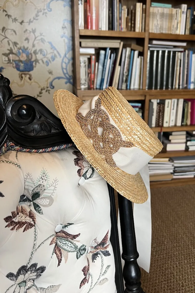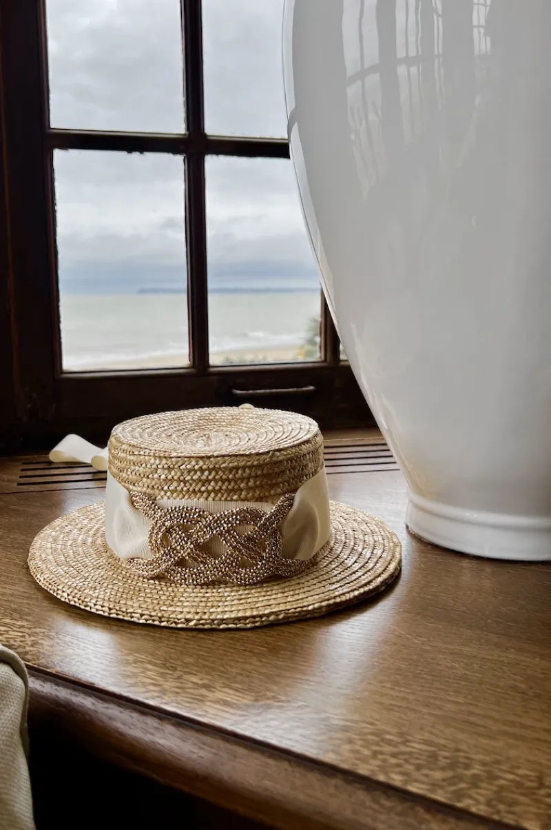 Le ruban autour du canotier se ferme par un noeud et est amovible.