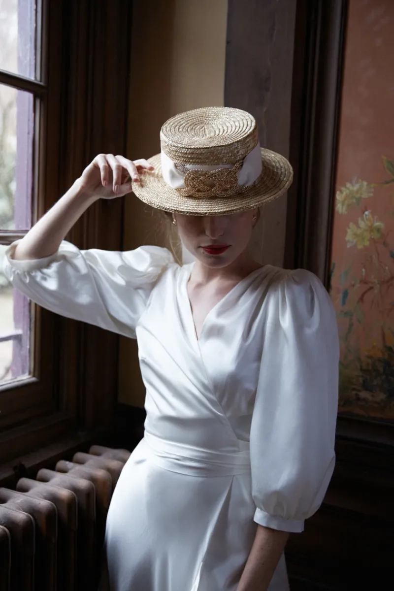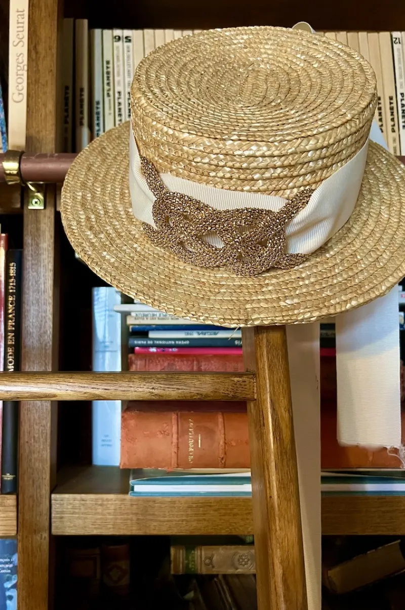Canotier orné d’un ruban de gros grain ivoire et d’une boucle dorée.