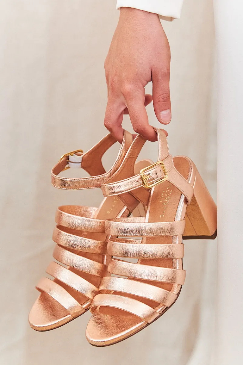 Escarpins à talon en chèvre métal rose, fermeture par une bride à la cheville avec une boucle dorée.