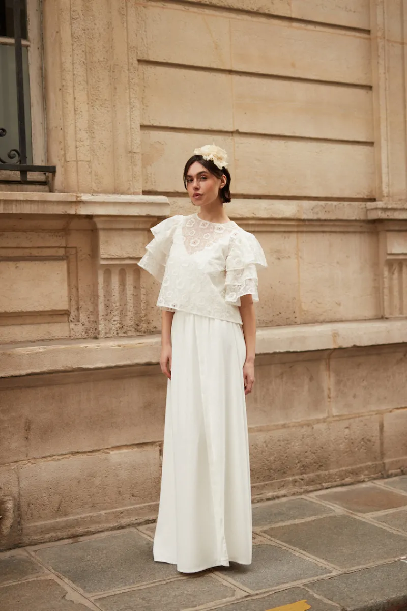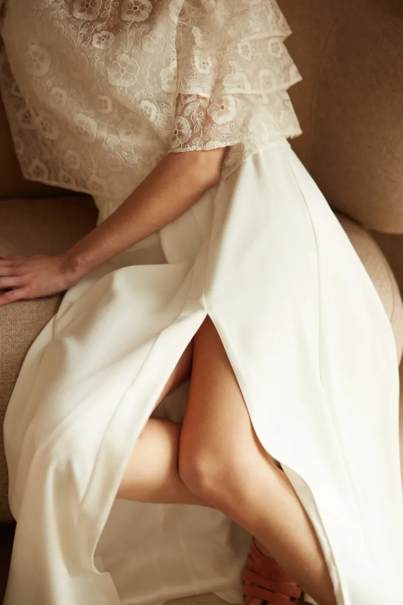 Jupe longue ivoire fluide avec une grande fente sur le côté.