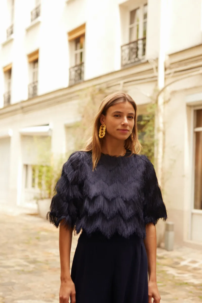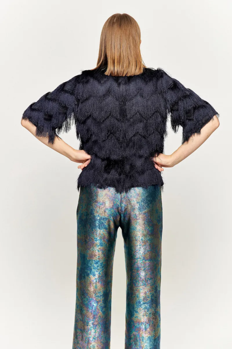 Blouse à franges marine et aux manches mi-longues. Fermeture zip au dos.