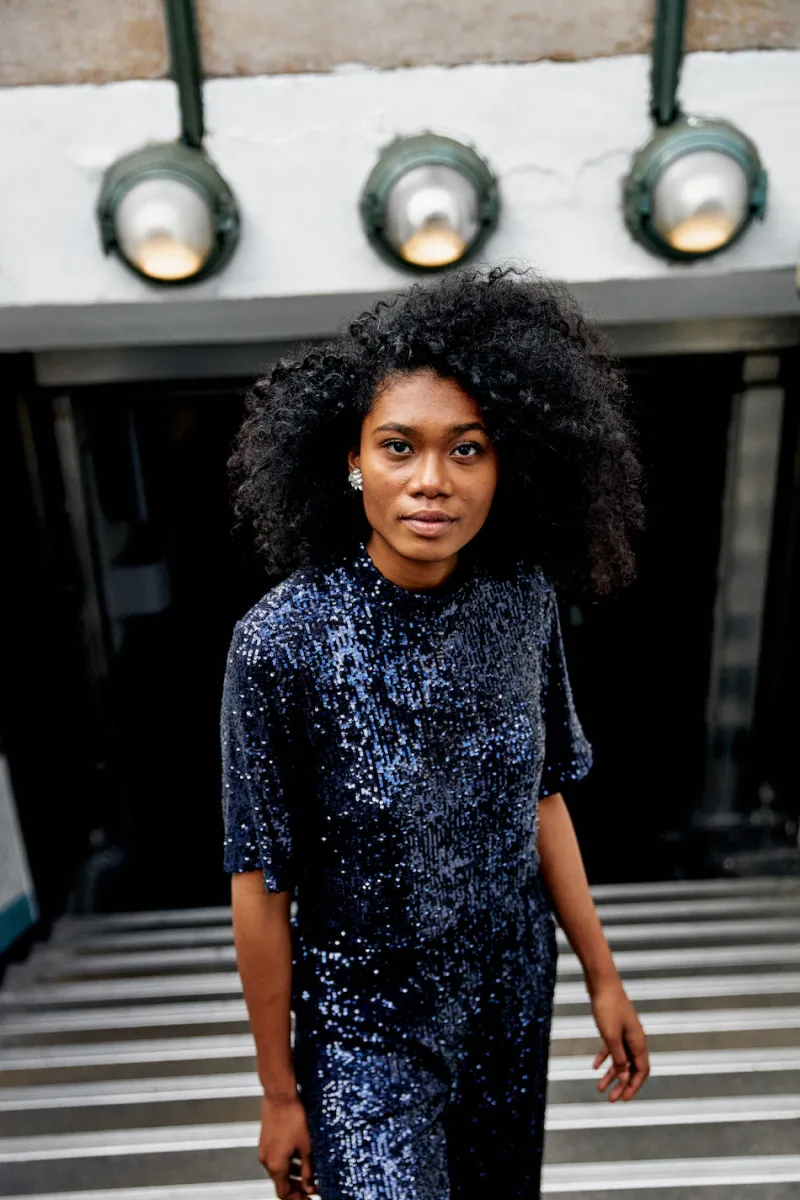 La mannequin aux cheveux tressés mesure 1,73m et porte la taille XS.
