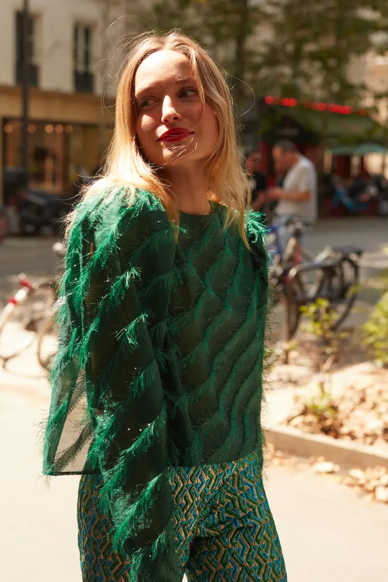 Pantalon en jacquard irisé. Fermeture zip sur le côté.