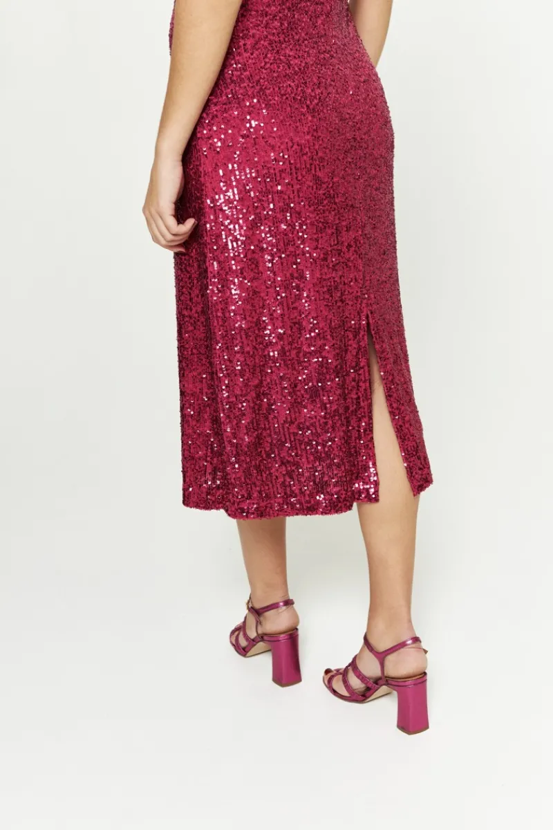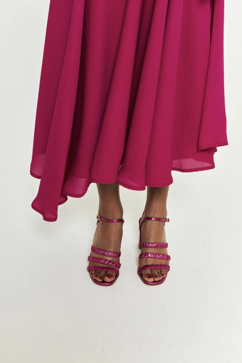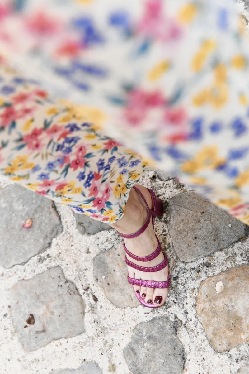 Escarpins à talon en chèvre métal rose couture, fermeture par une bride à la cheville avec une boucle dorée.