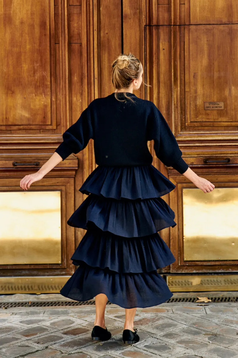La jupe Cristina marine, un modèle singulier et bohème. Entièrement parée de volants, cette pièce couture est parfaite associée à une paire de ballerines ou des bottes et portée avec notre pull Claude.