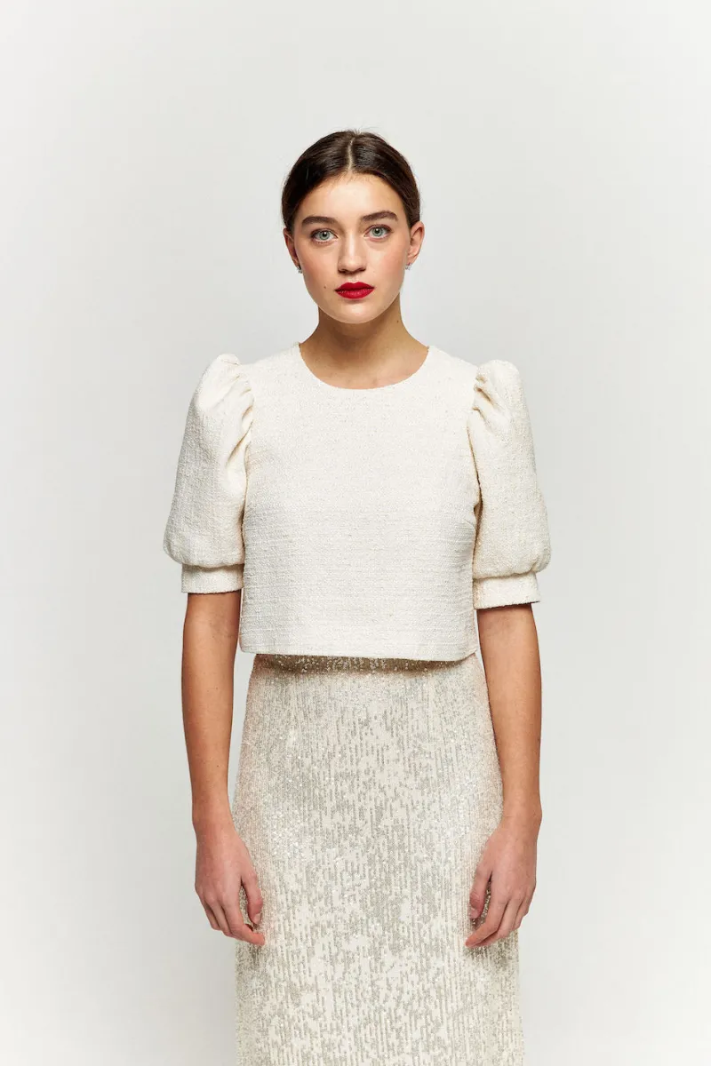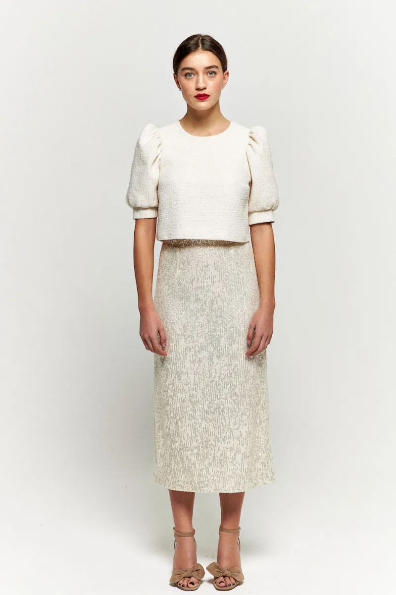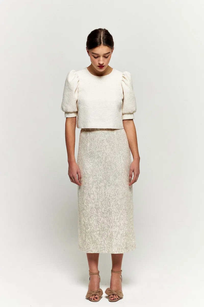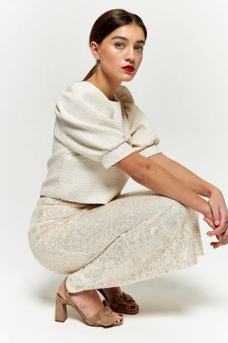 Une jupe wahou pour briller la journée et danser toute la soirée. Vous n’aurez plus envie de la quitter ! Ses sequins ivoire et sa coupe droite suffisent à l’imposer comme une pièce d’exception de votre garde robe.