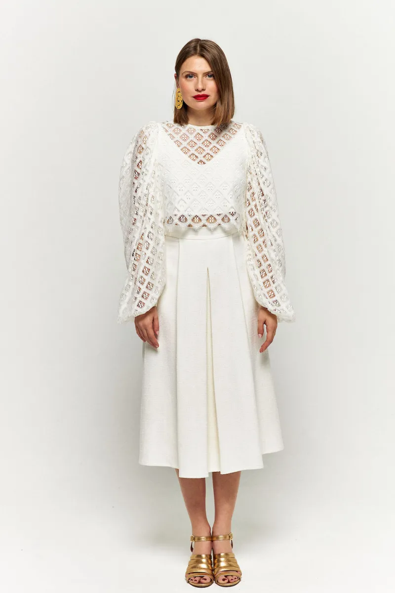 Blouse ivoire en dentelle et à manches bouffantes.