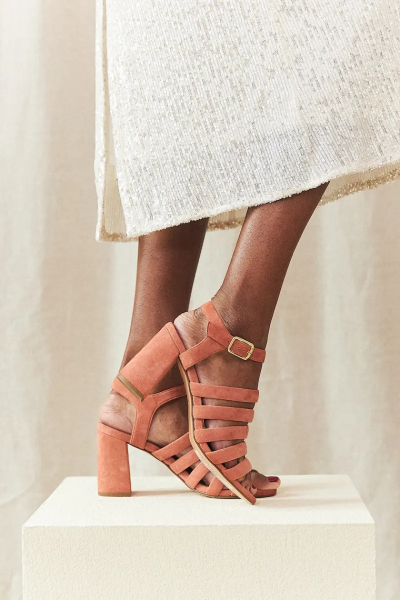 Escarpins à talon en chèvre velours rose blush, fermeture par une bride à la cheville avec une boucle dorée.