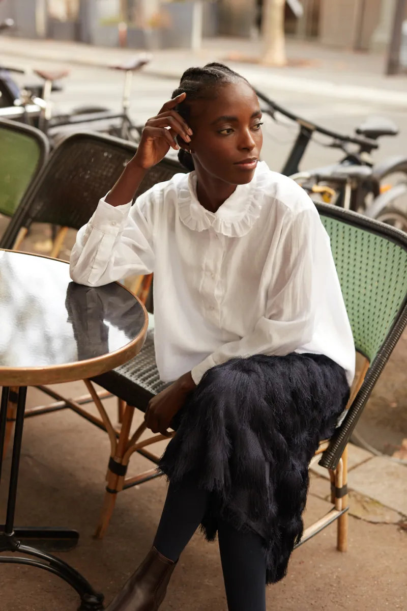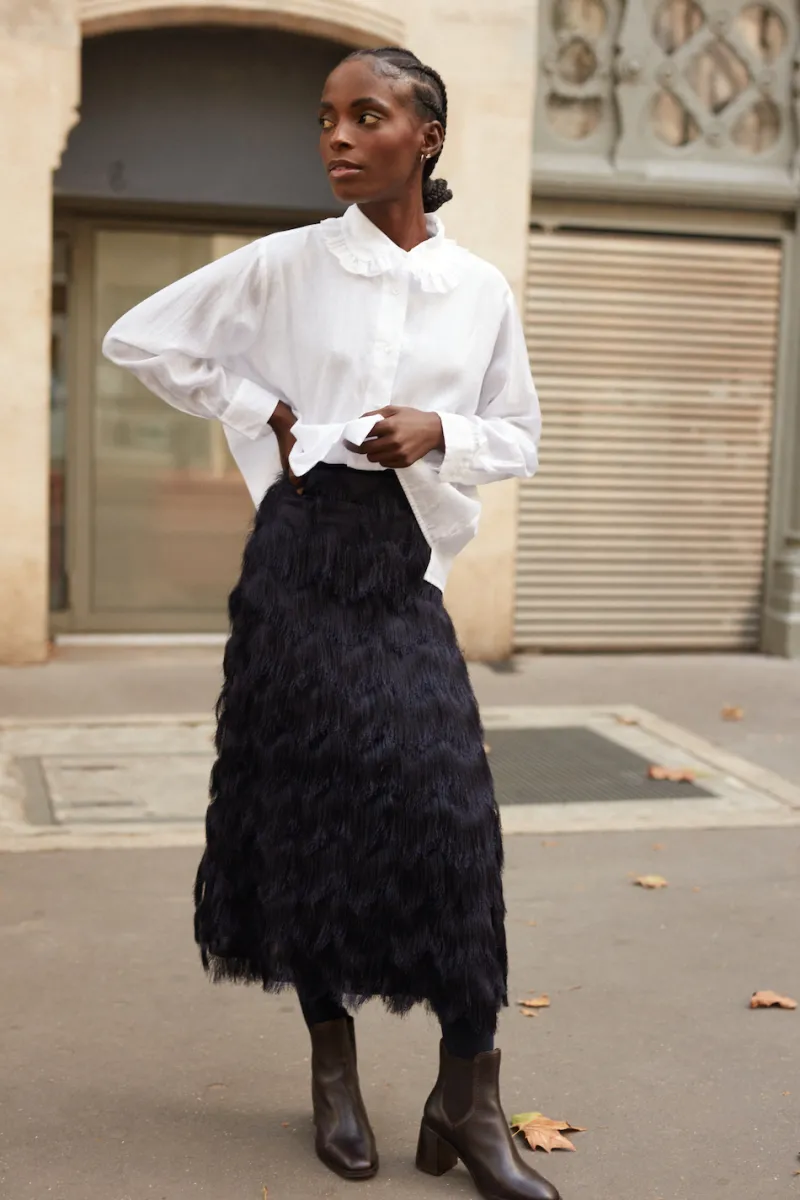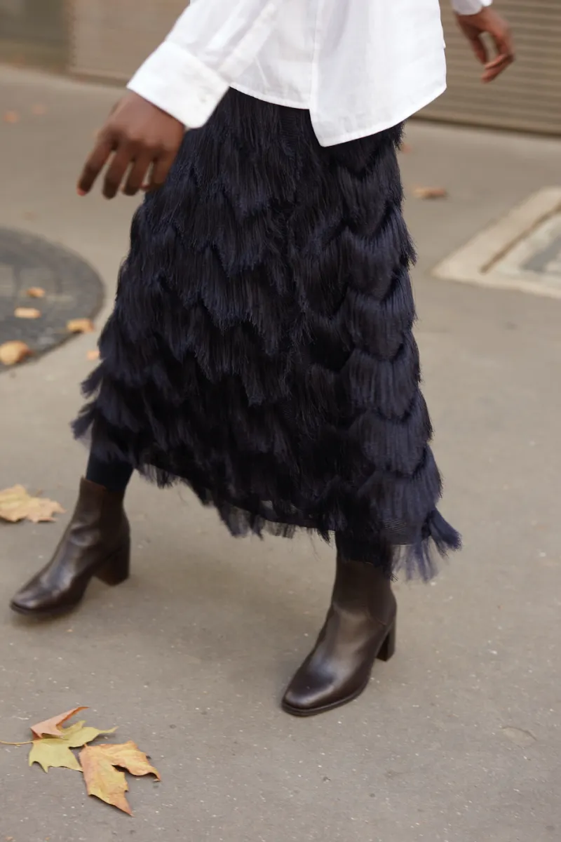 Résolument mode, la jupe Pacôme marine offre élégance et légèreté à votre tenue. Ses franges similaires à des plumes ajoutent de la douceur à votre look.
