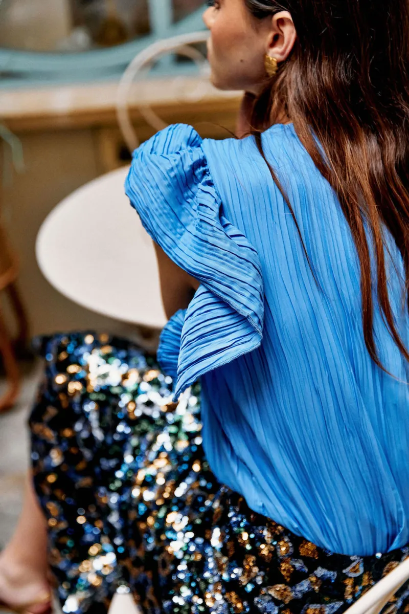 Blouse sans manches à volants aux épaules en tissu plissé. Fermeture zip au dos.