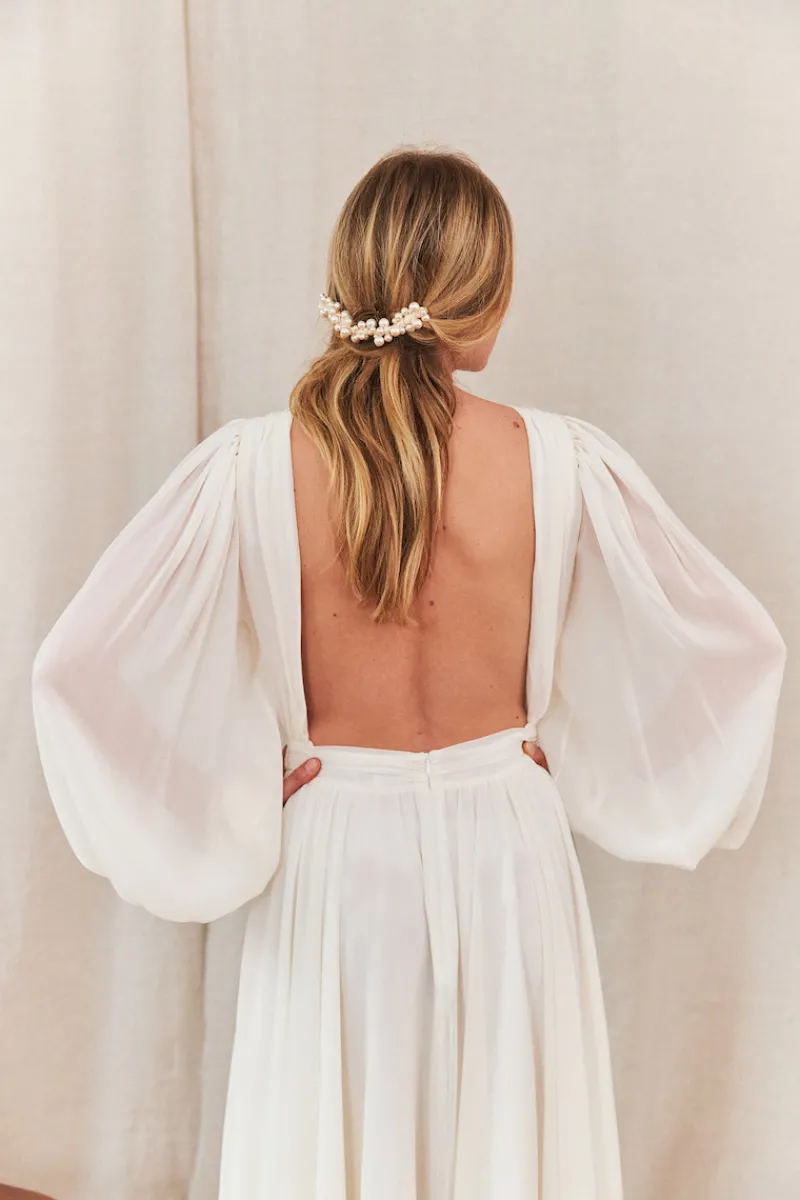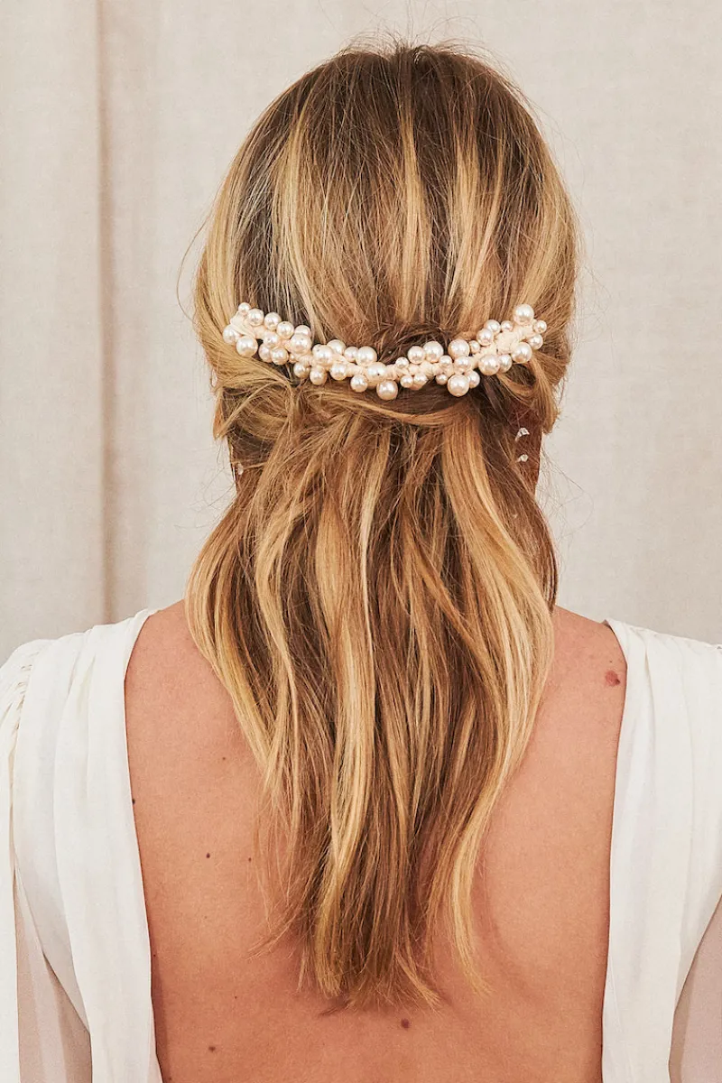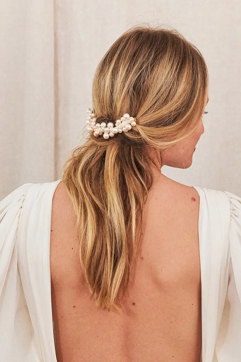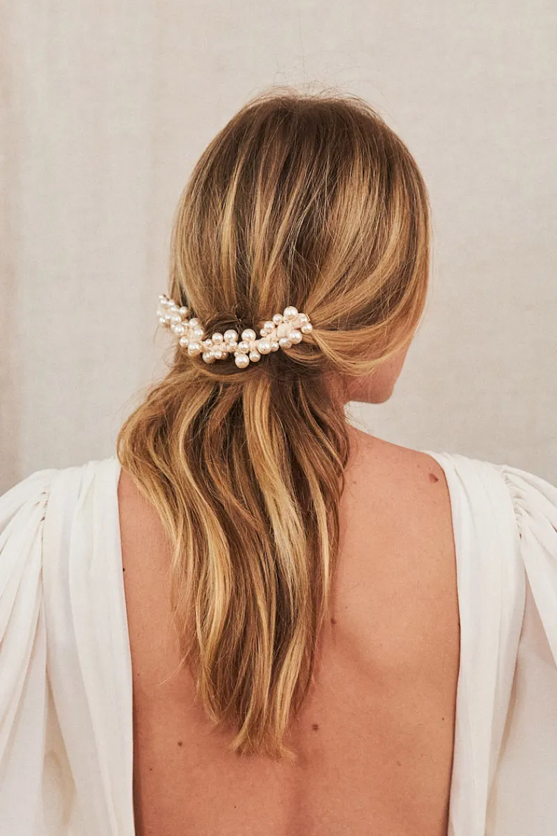 Pièce d’exception avec ses perles de nacre assemblées une par une à la main, notre ornement Riviera illumine le visage et rehausse le regard.